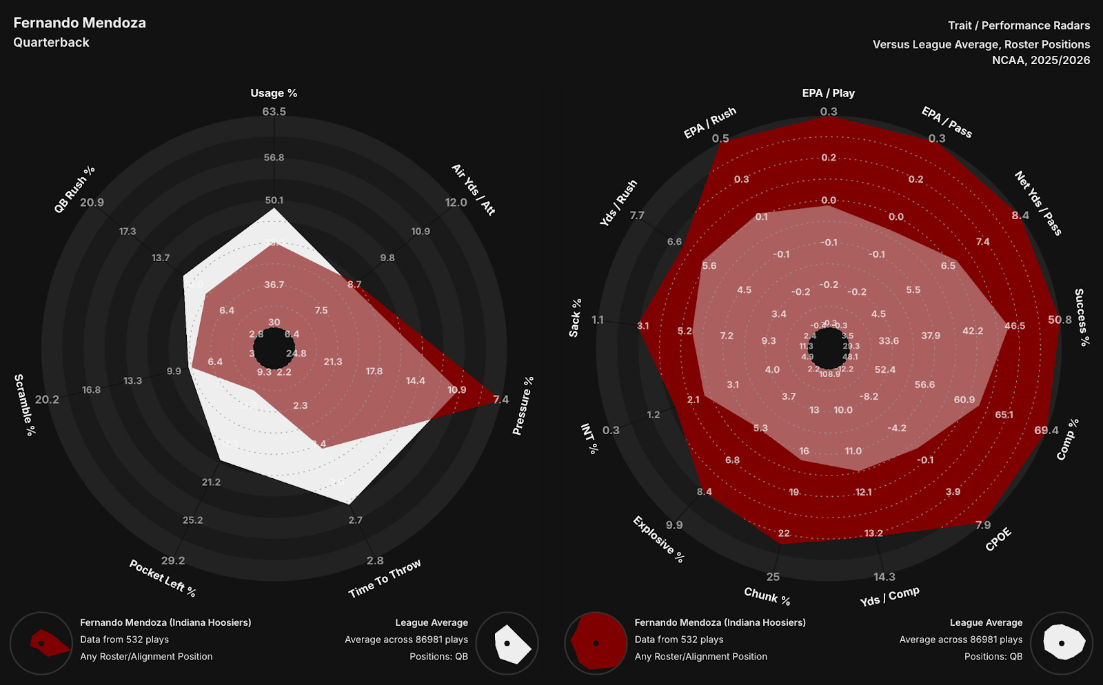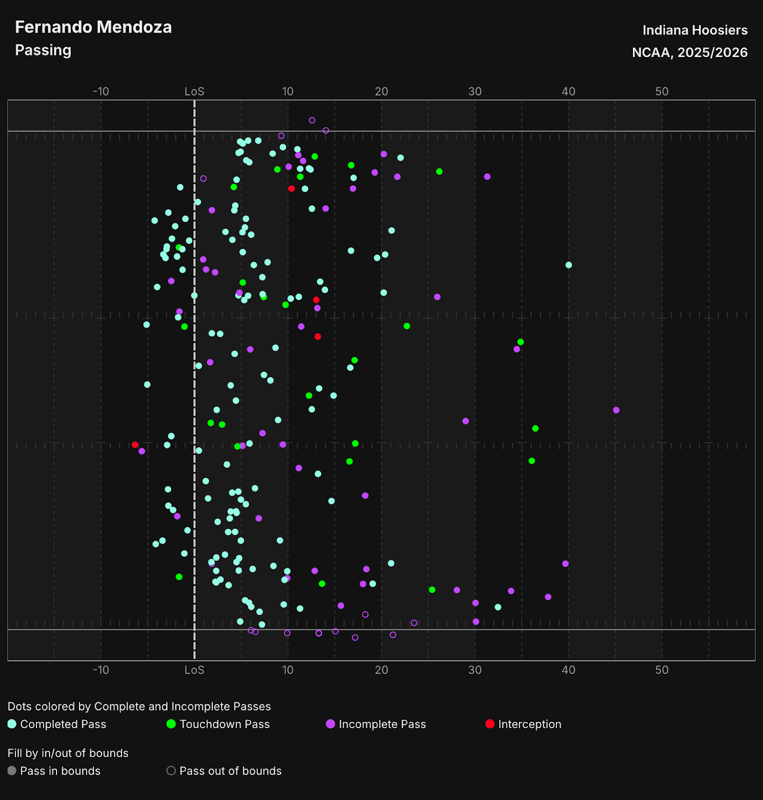 Mendoza is a sharpshooter with prototypical size, elite accuracy, and a good, but not great arm. Indiana’s RPO-heavy scheme and penchant for blowouts make Mendoza a tricky evaluation. While he’s shown the ability to attack tight windows and throw with anticipation, he isn’t asked to move off of his first read very frequently. He’s also usually on the sideline or running the clock out by the start of the fourth quarter, so he only gets ~75% as much tape as other quarterbacks. The lack of high-leverage throws clouds the analysis, but Mendoza’s timing and ball placement give him a high floor in multiple schemes.