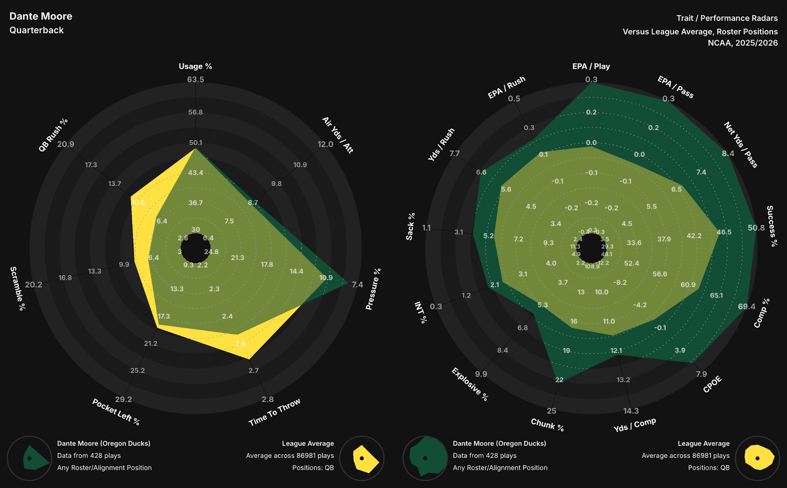 Moore executes full-field reads and throws with exceptional timing and ball placement within structure. He cycles through reads efficiently and makes rapid decisions while protecting the football. He prefers to win from the pocket, but has the accuracy and playmaking instincts to create when the play breaks down (like the Penn State game). The Indiana tape exposed his average escapability, but it’s the lone blemish on Moore’s résumé