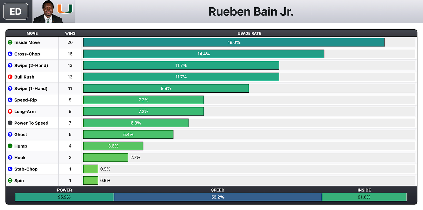 Bain is a densely built edge defender with a deadly blend of speed and power. His arm length is well below average, but he’s a great athlete for his size with surprising flexibility at the top of the arc. At 275 pounds, he bursts into contact and has natural leverage to convert speed to power effectively. But he also has a wide array of hand moves and wins the corner much more frequently than a player of his size should.