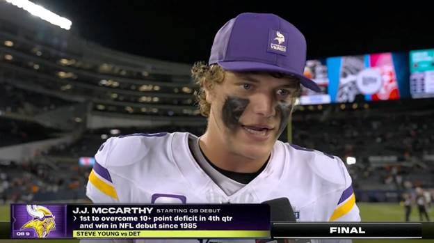 The fourth-quarter heroics of McCarthy are going to be compared to historical greats for the next week, none captured perhaps more hyperbolically than by the Monday Night Football broadcast itself, which dug up a statistic indicating that McCarthy is the first quarterback to overcome a ten-point deficit in his debut in the fourth quarter since Steve Young’s arrival onto the scene against the Detroit Lions in 1985.