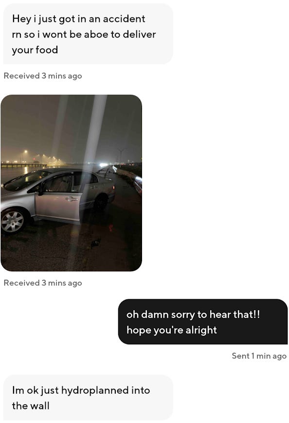 At 12:03 a.m., my DoorDash driver lets me know that he has crashed his car.