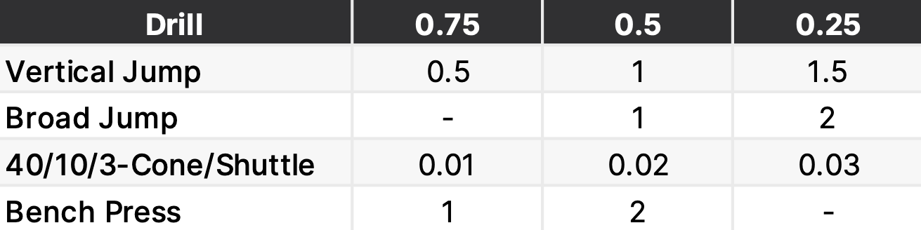 The table above shows how much partial credit a claim receives based on the drill and severity of the miss. For example, if a player’s actual vertical jump is within 0.5 inches of the reported number, the score for that claim is 0.75. Misses of 1.0 and 1.5 inches are scored 0.5 and 0.25, respectively.