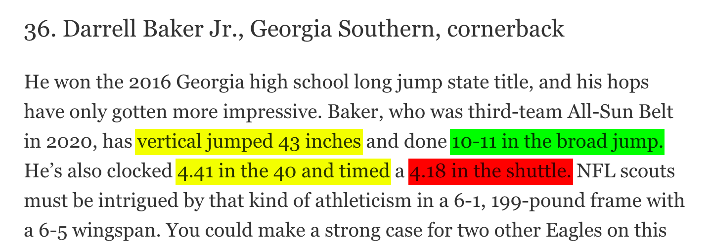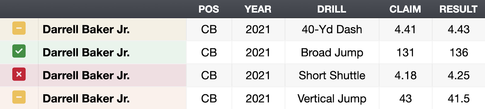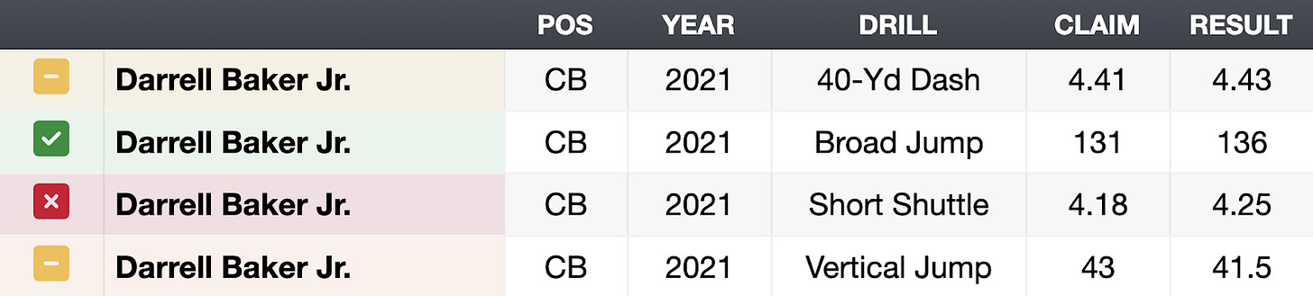 Darrell Baker Jr.’s section in the 2021 Freaks List exemplifies the value of adjusted accuracy. He exceeded expectations in the broad jump, which was five inches better than reported, but fell short on the other three claims.