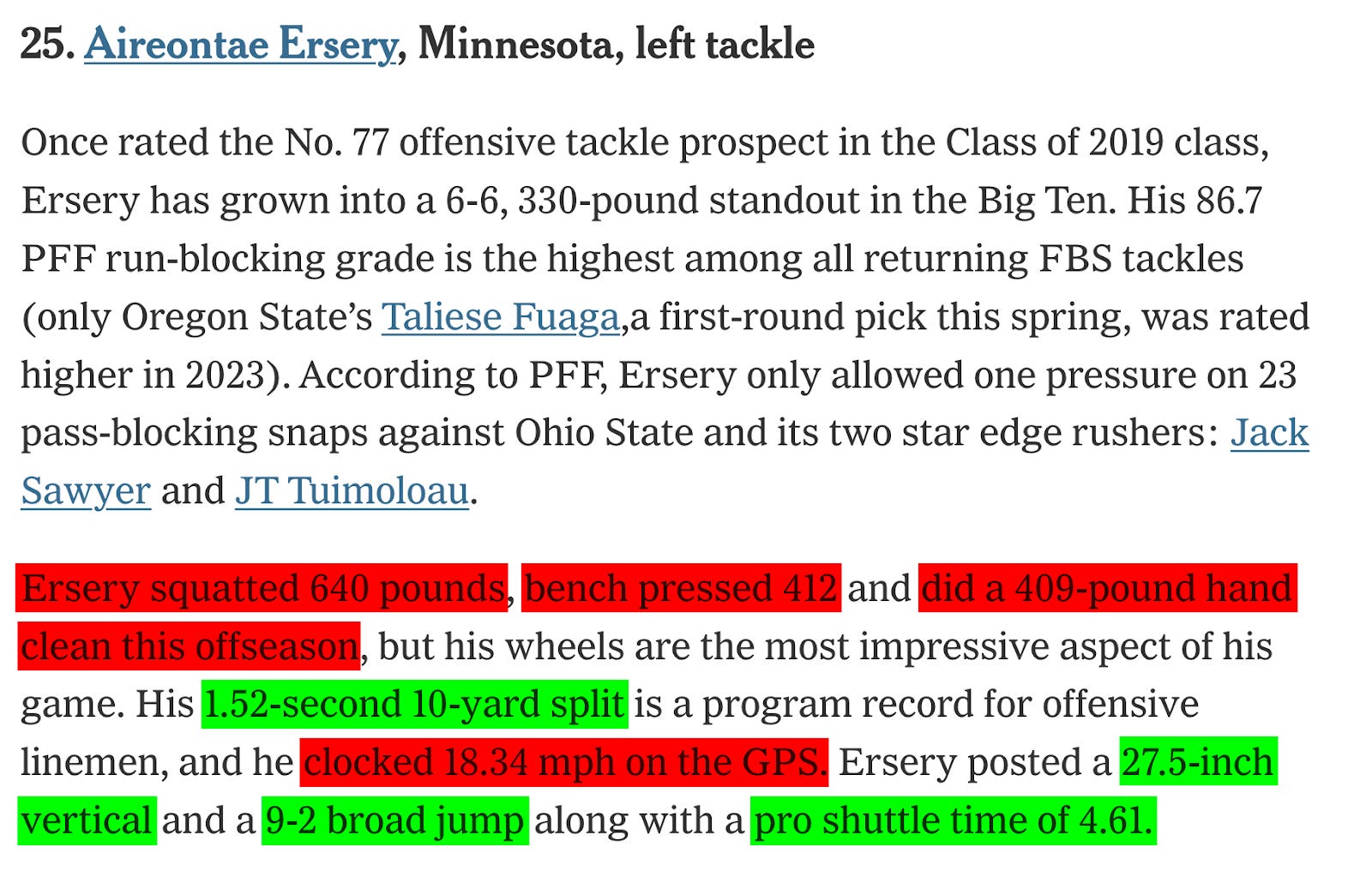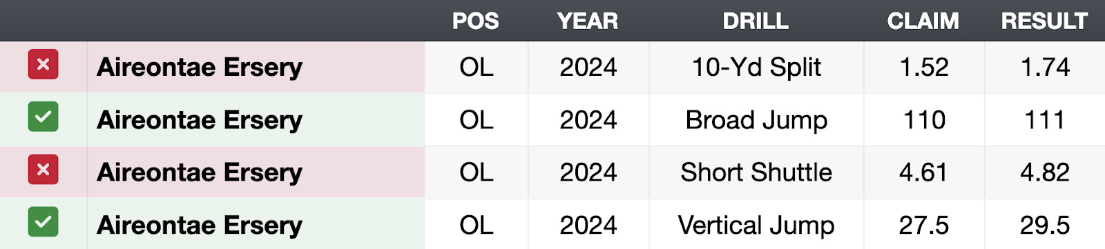 Looking at Aireontae Ersery’s 2024 blurb, for example, the statements highlighted in green all qualify as claims, while those in red do not. Any reported tracking data or weight-room feats (aside from 225 bench press reps) cannot be verified and aren’t considered “claims.”