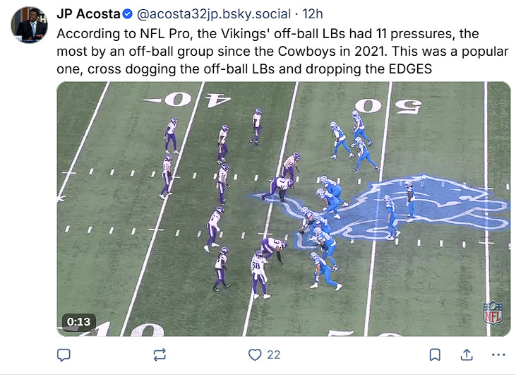 PFF also credited the Vikings with 26 individual pressures (multiple players can generate a pressure on the same play), 11 of which came from their three off ball LBs — Eric Wilson (6), Blake Cashman (3), and Ivan Pace Jr. (2). This matches the total NextGenStats has, and is apparently the most for a single team since 2011:
