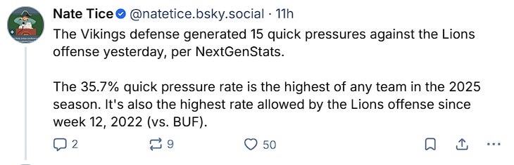 The stats are impressive. Goff was under pressure on 18 of his 42 dropbacks, a 42.9% rate per PFF. According to NextGenStats (via NFLPro), they had an average time to pressure of 2.19 seconds during the week, which was by far the fastest of any team in Week 9; the Los Angeles Rams were second at 2.43 seconds. They did this because they generated 15 quick pressures, which are pressures that affect the QB in less than 2.5 seconds. That 35.7% rate was the highest of any team in 2025 so far: