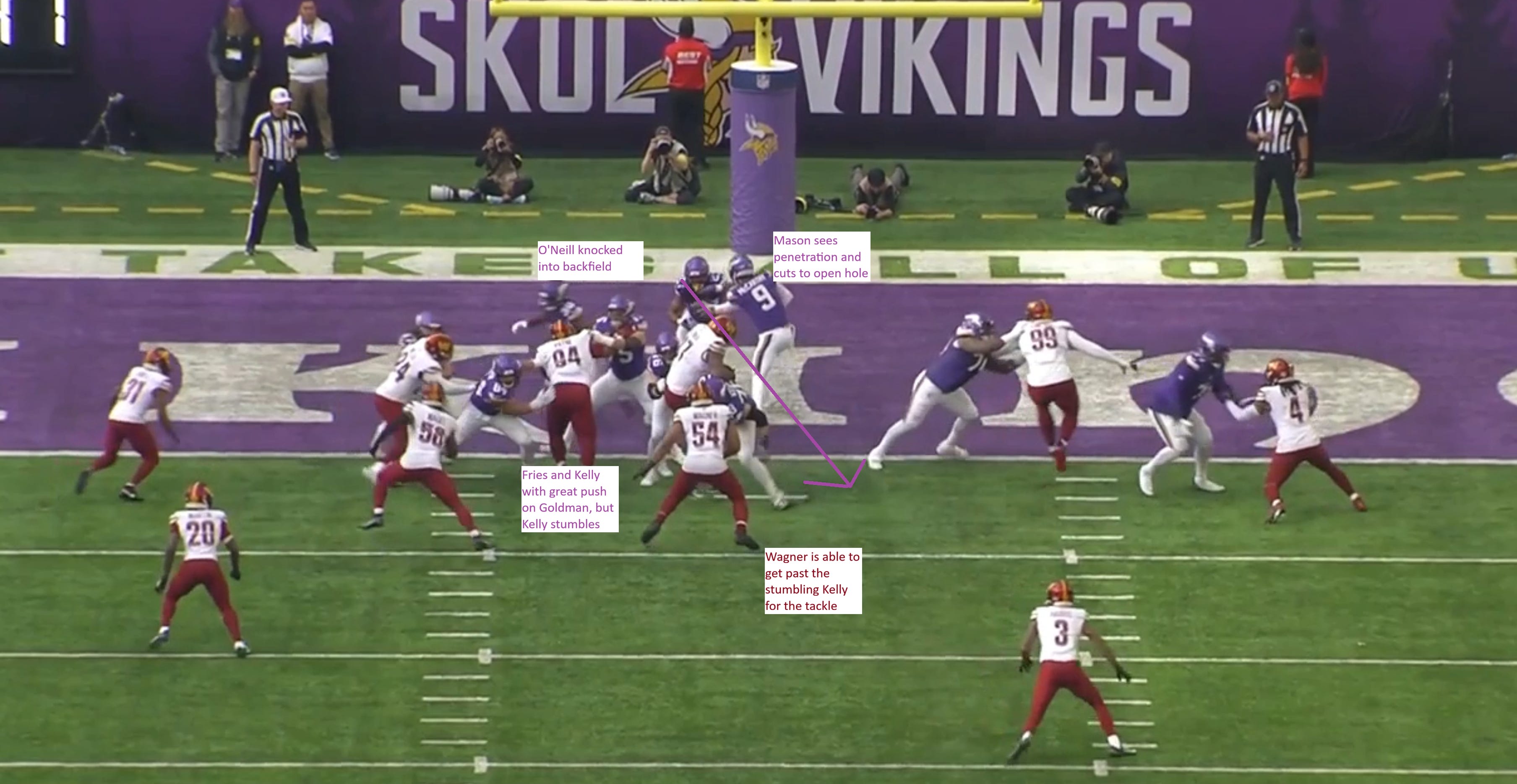 This leaves a wide hole for Mason, and while Kelly trips on his way to Wagner, who makes the tackle, Mason is still able to grind out a respectable 5-yard gain to give the offense some breathing room.