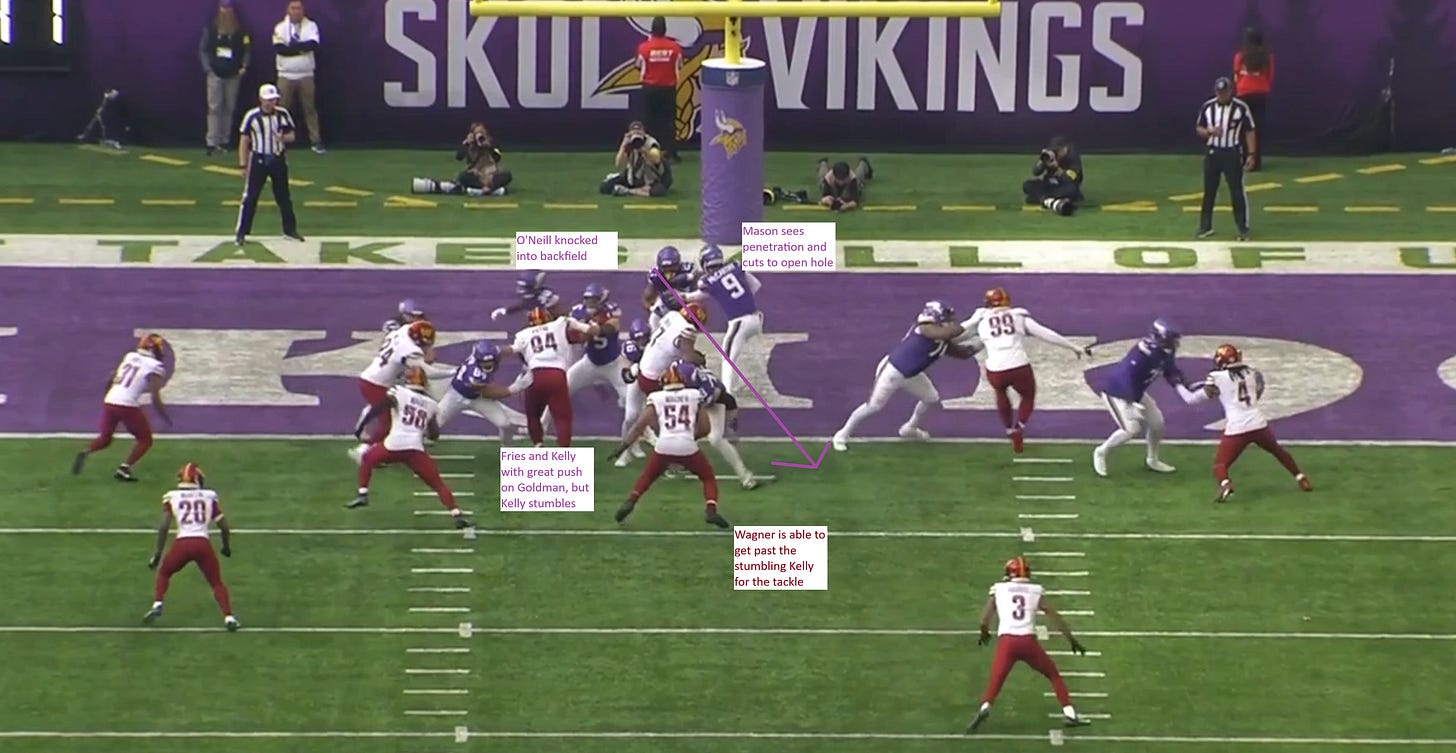 The Vikings started off the drive backed up at their own two-yard line after forcing a turnover on downs by Washington. The Vikings run inside zone out of the I-Formation. Fullback C.J. Ham kicks outside to block the corner, and the play design may take running back Jordan Mason to Ham’s path initially, but he quickly recognizes the knockback that right tackle Brian O’Neill generates against defensive tackle Daron Payne.