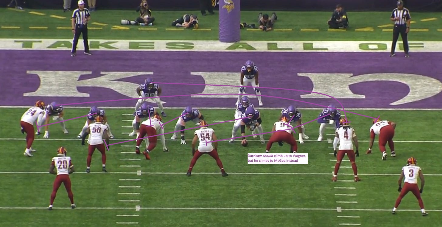 Either way, this play gets messed up by a run ID issue. Both Kelly and left tackle Christian Darrisaw climb up to linebacker No. 58 Jordan McGee. I believe Darrisaw should come off of his double team with left guard Donovan Jackson and block Wagner, who ends up unblocked on the play, and makes the tackle for no gain. Ham can’t block both Wagner and Luvu.
