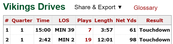 Both of those drives ended in field goals, which means they don’t quite match what we’re looking for: a field goal counts as a play. On those drives, the Vikings ran 18 offensive plays and 1 special-teams play, whereas on this drive they ran 19 offensive plays. So, by plays, this is the longest TD drive that we know of in Vikings’ history.