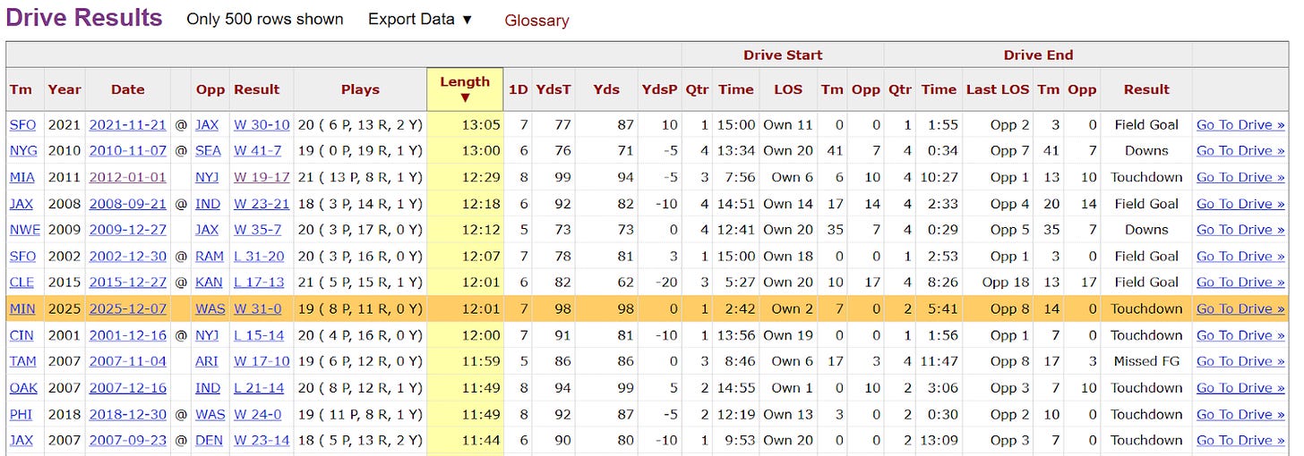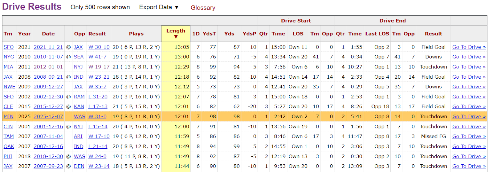 Then there’s the element of time. The Vikings started their drive with 2:42 left in the first quarter and scored with 5:41 left in the second, nearly erasing a whole quarter. That’s the most time a drive has taken up since San Francisco in 2021 (who have the longest recorded drive, taking up 13:05 on 20 plays), and ranks 8th longest among all drives. It’s third among drives that did not involve a penalty, and second among drives that ended in a TD, behind only the 2011 Miami Dolphins.