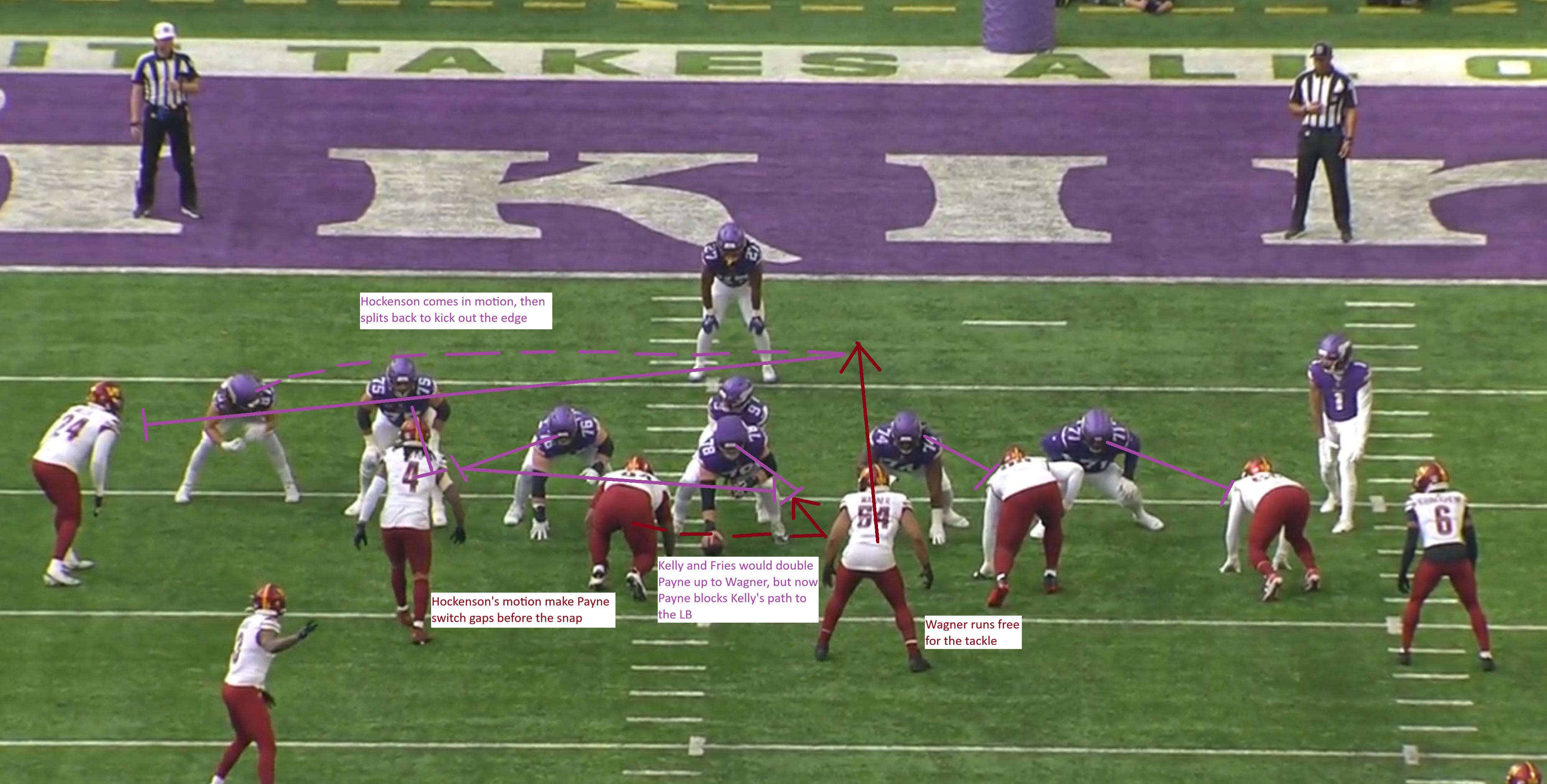 As Hockenson motions, Payne shifts from the A gap between Kelly and Fries to the opposite A gap, between Kelly and Jackson. In the original formation, Kelly would climb to Wagner while putting a hand on Payne to help Fries reach block him.