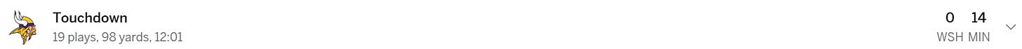 In 52 characters, ESPN’s Game Center blandly summarized one of the most dominant drives of the season, one the Minnesota Vikings put together in last Sunday’s game against the Washington Commanders.