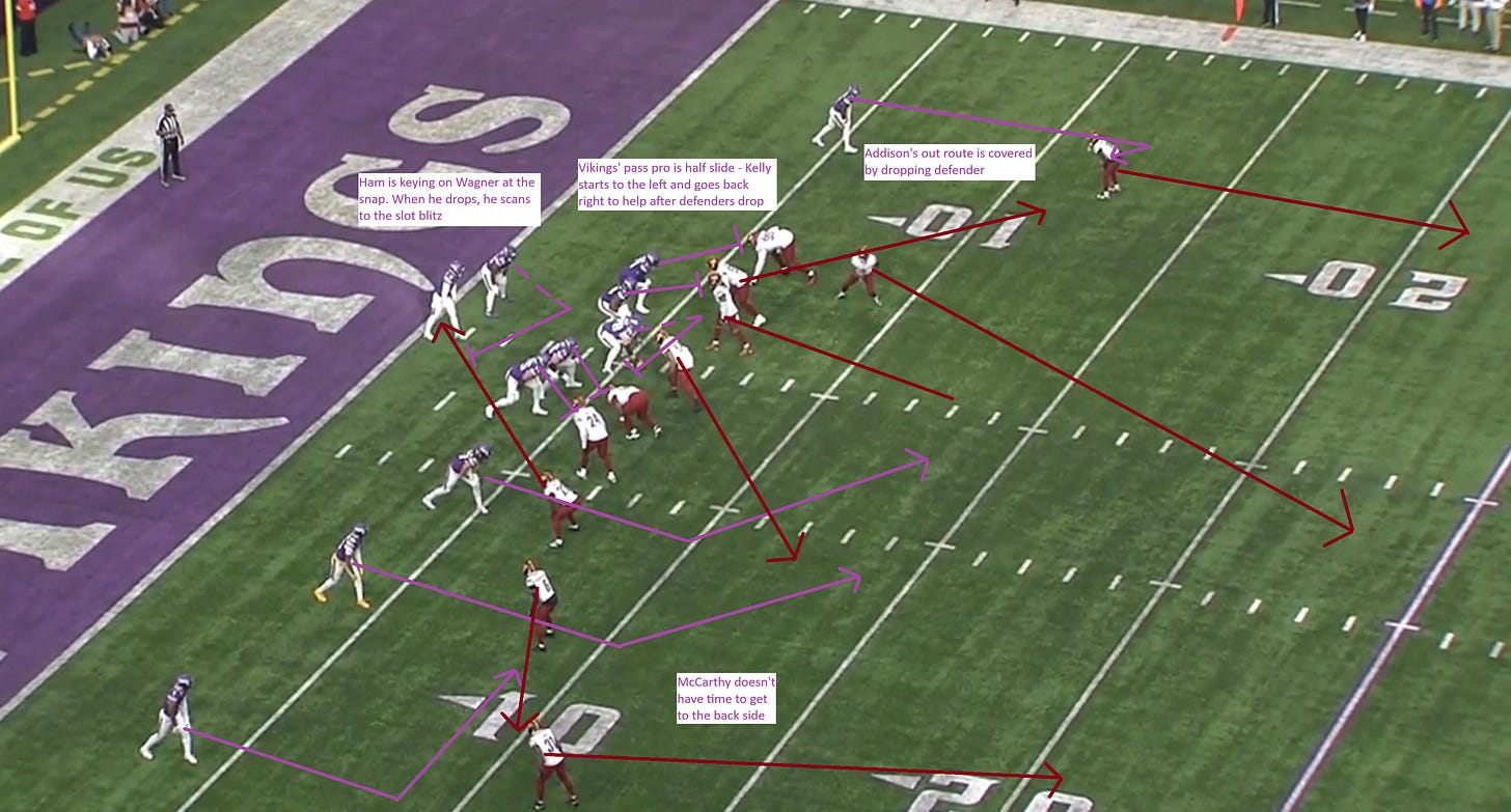 That leaves Ham, who was scanning the middle of the line, to get all the way to his right and make a tough block, or Martin would have a free run at McCarthy. Ham does just that, and great pass protection from him means McCarthy avoids the sack.