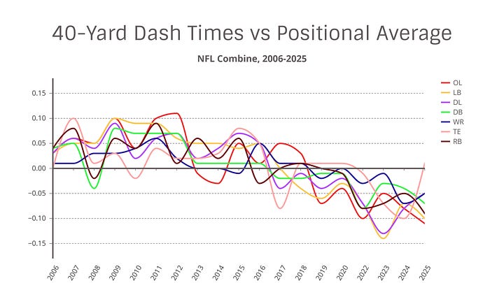 This is a general trend we have seen since 2006, but the changes in speed were gradual and uneven across groups. It’s easier to identify when we move from overall 40 time (by combine-designated position group) to 40 time against positional average.
