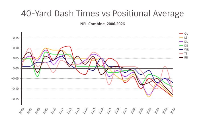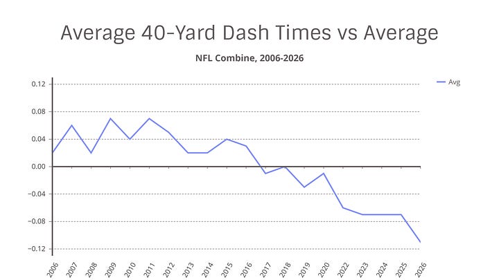This makes it clear that, before ever including the 2026 data, there was already a trend of faster 40-yard dash times over the years. But 2026 represents a meteoric leap.
