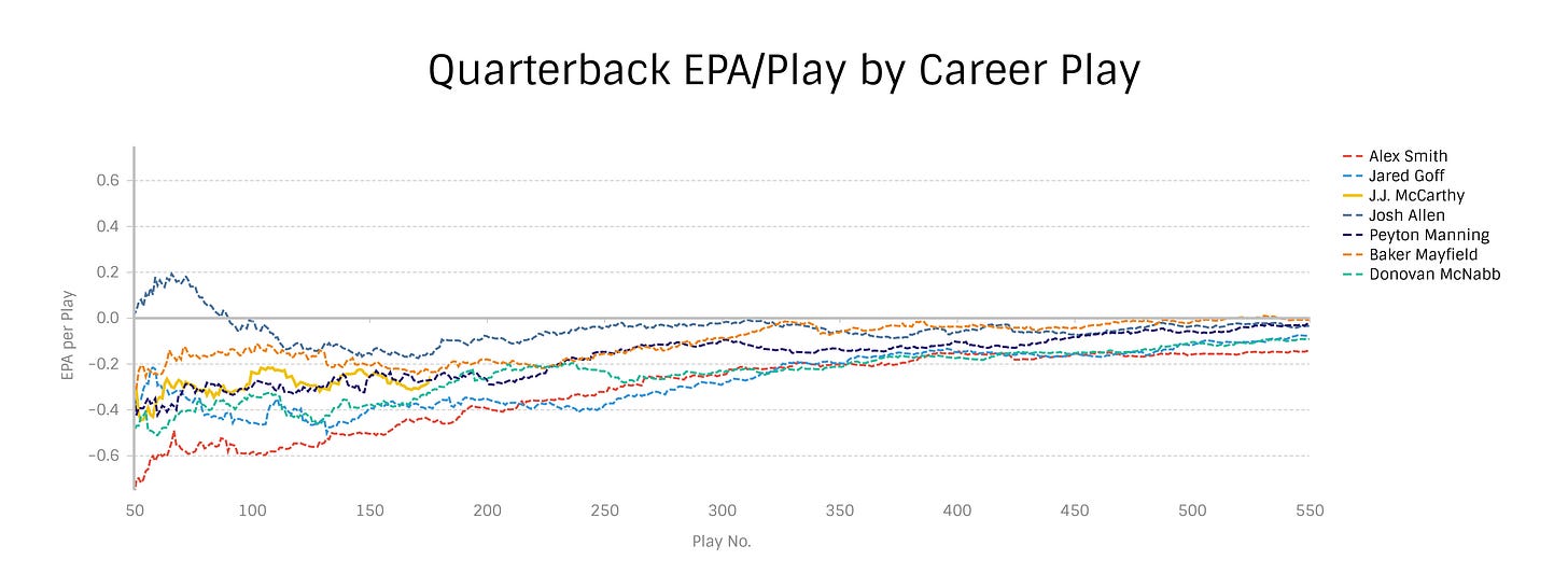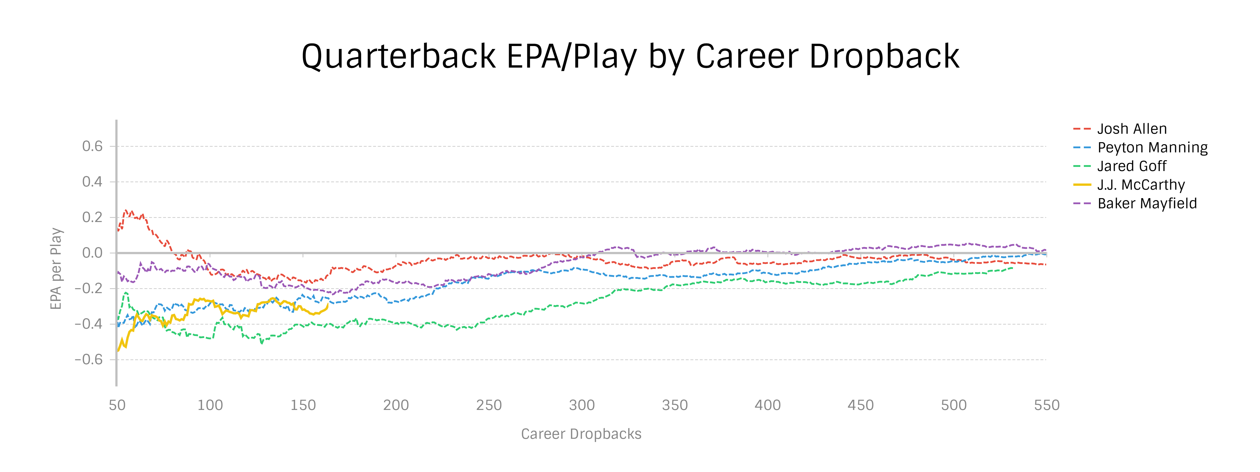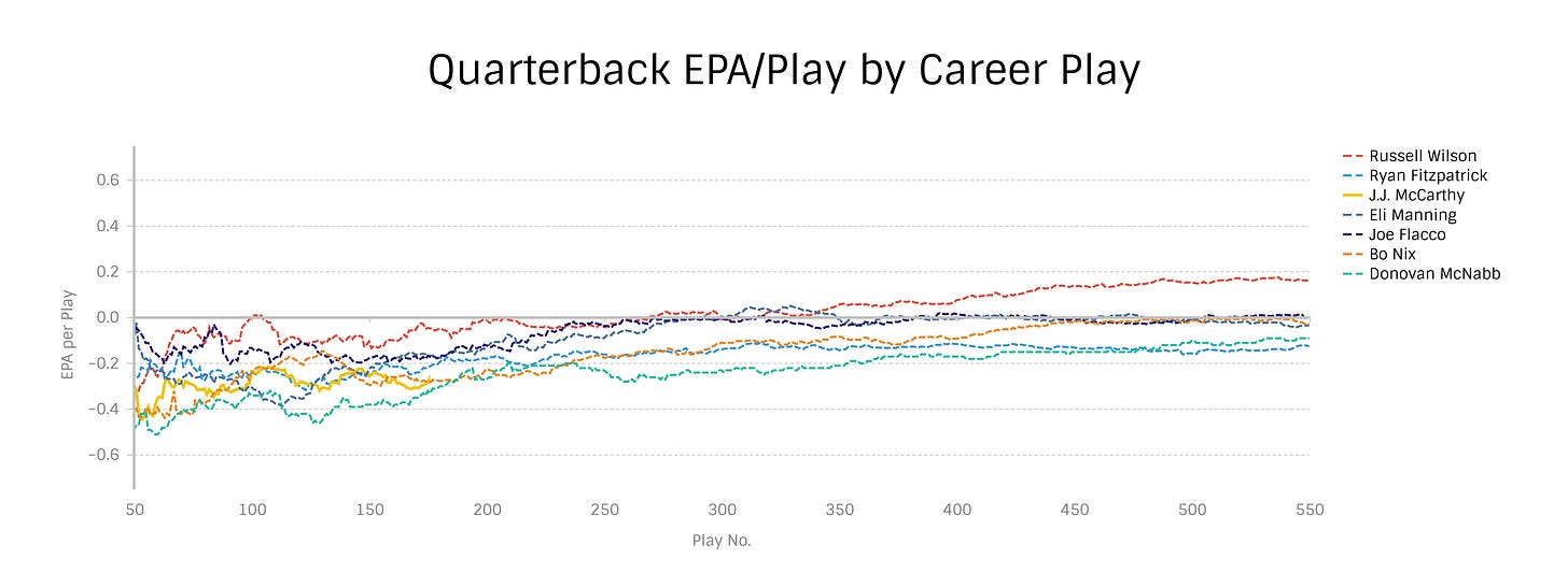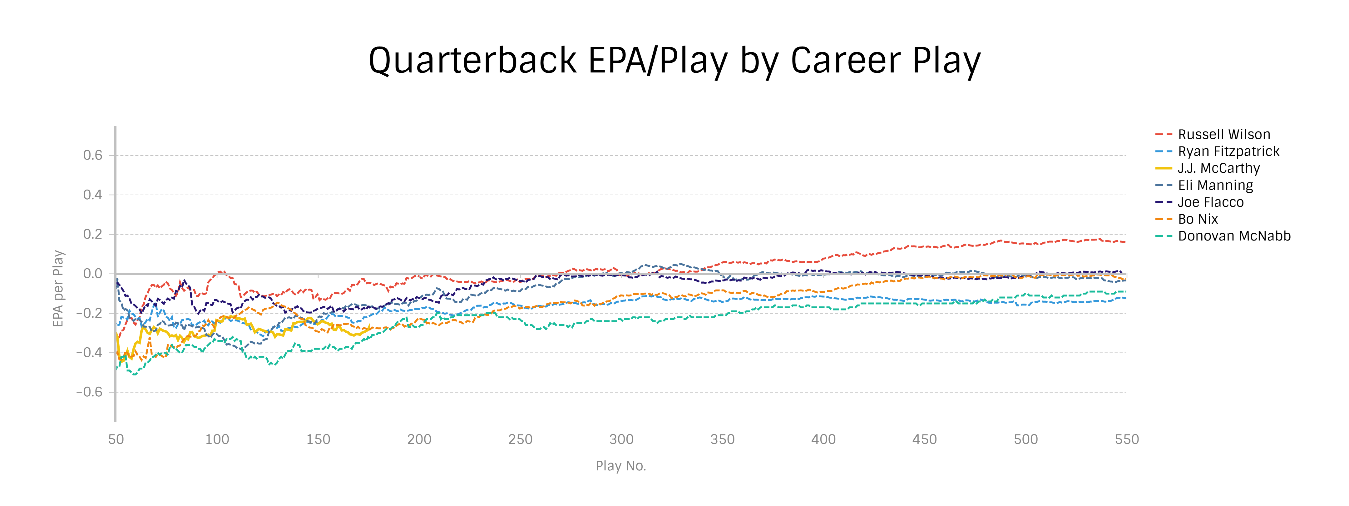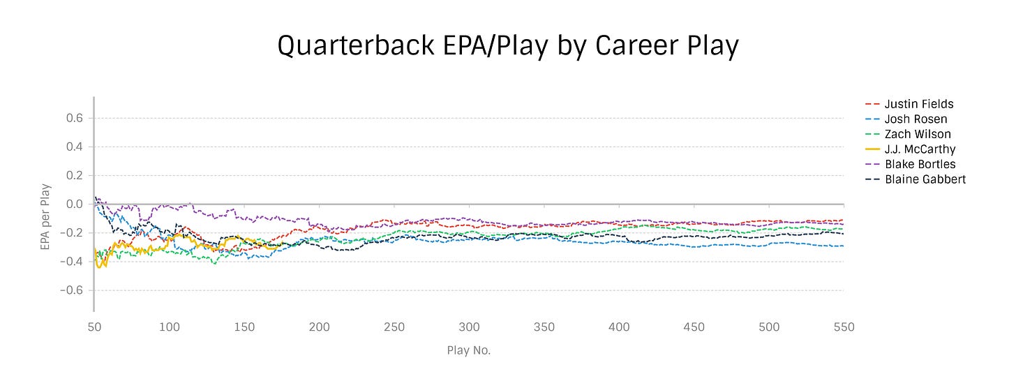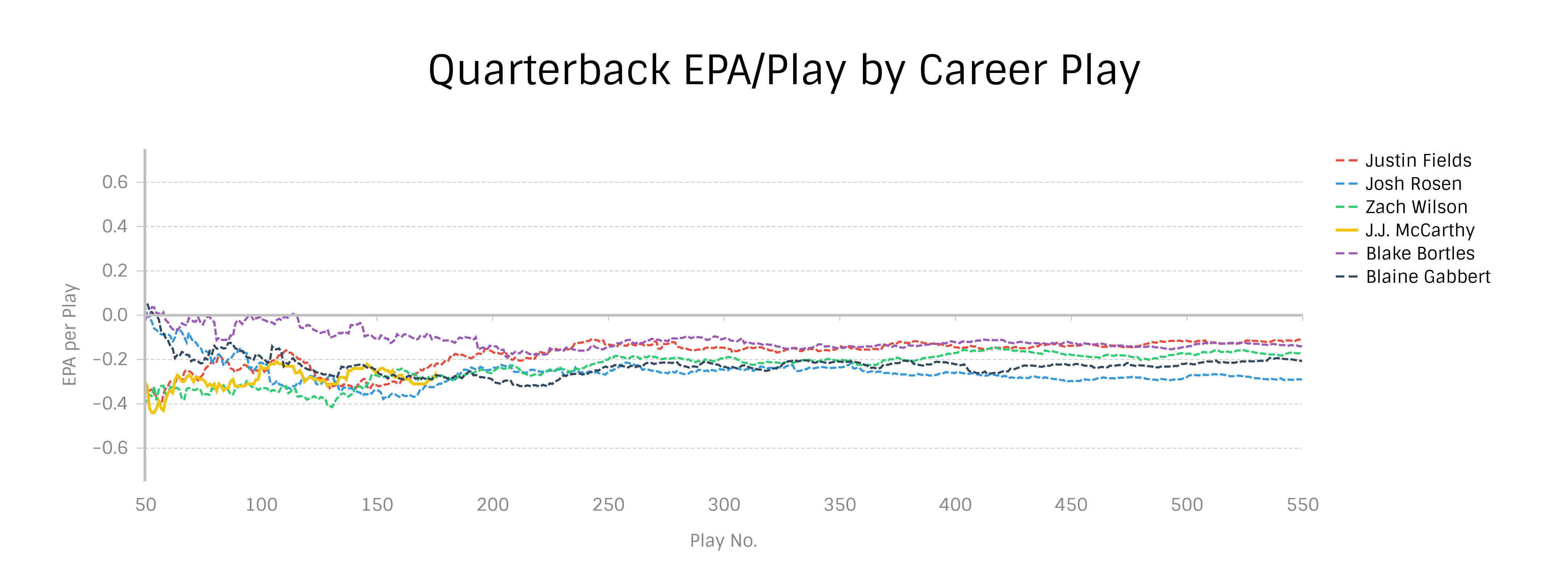 One thing that seems to be clear from these charts is that by the time a quarterback hits around 350 plays, they should probably be meaningfully improving in their production in order for us to have confidence that they can turn things around and be excellent moving forward.