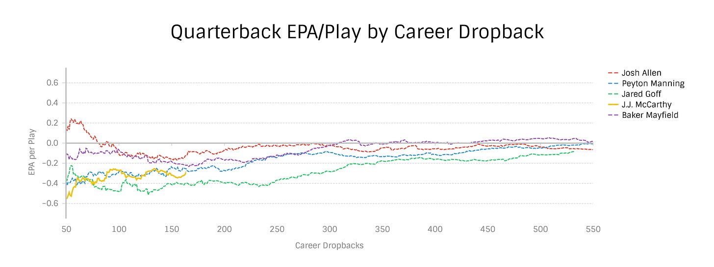 McCarthy is simply playing at a level well below his peers. The chart above doesn’t account for rushing, which does give him a boost, but it’s clear that the problems with his passing aren’t just a product of unfortunate environmental variables.