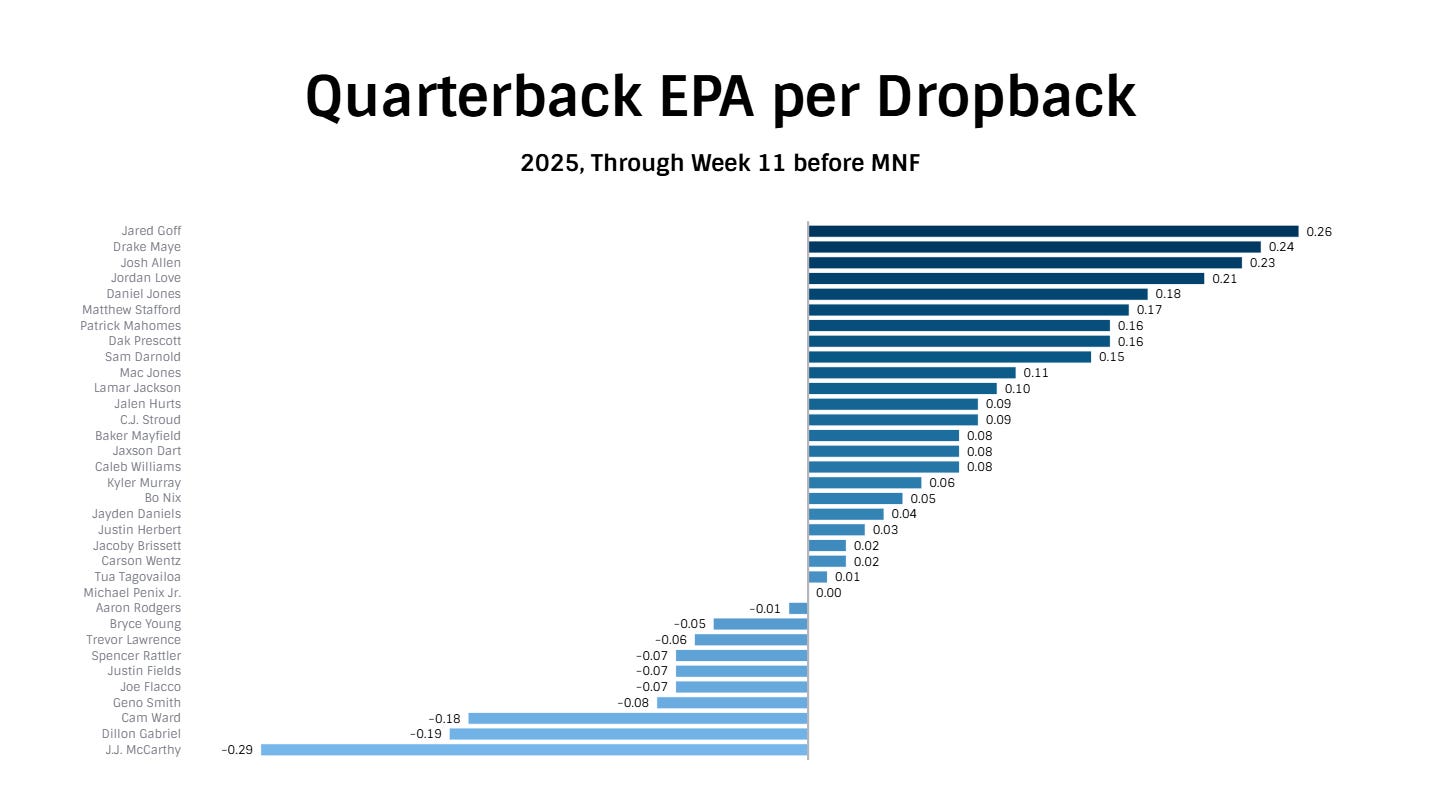 But looking at performance per dropback is a bit limiting, right? We’d miss out on the holistic contributions of players like Josh Allen, Lamar Jackson, Russell Wilson, Daniel Jones, Jayden Daniels and others.