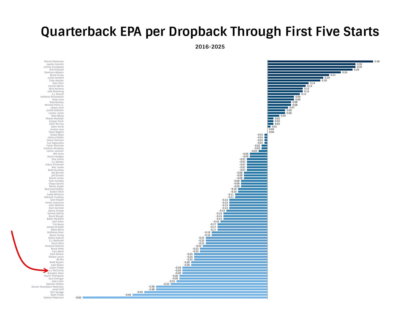 And it’s not easily explainable as purely a product of early NFL play. Against other quarterbacks over the past decade in their first five starts, McCarthy is a bottom-level performer.