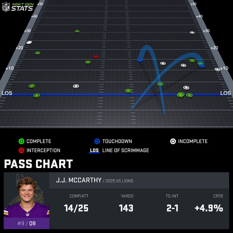 The box score doesn’t look kind to him; With 14 completions on 25 attempts, McCarthy finished with a completion rate of just 56.0 percent. More directly relevant to his performance, he generated just 5.72 yards per passing attempt and 3.87 net yards per dropback.