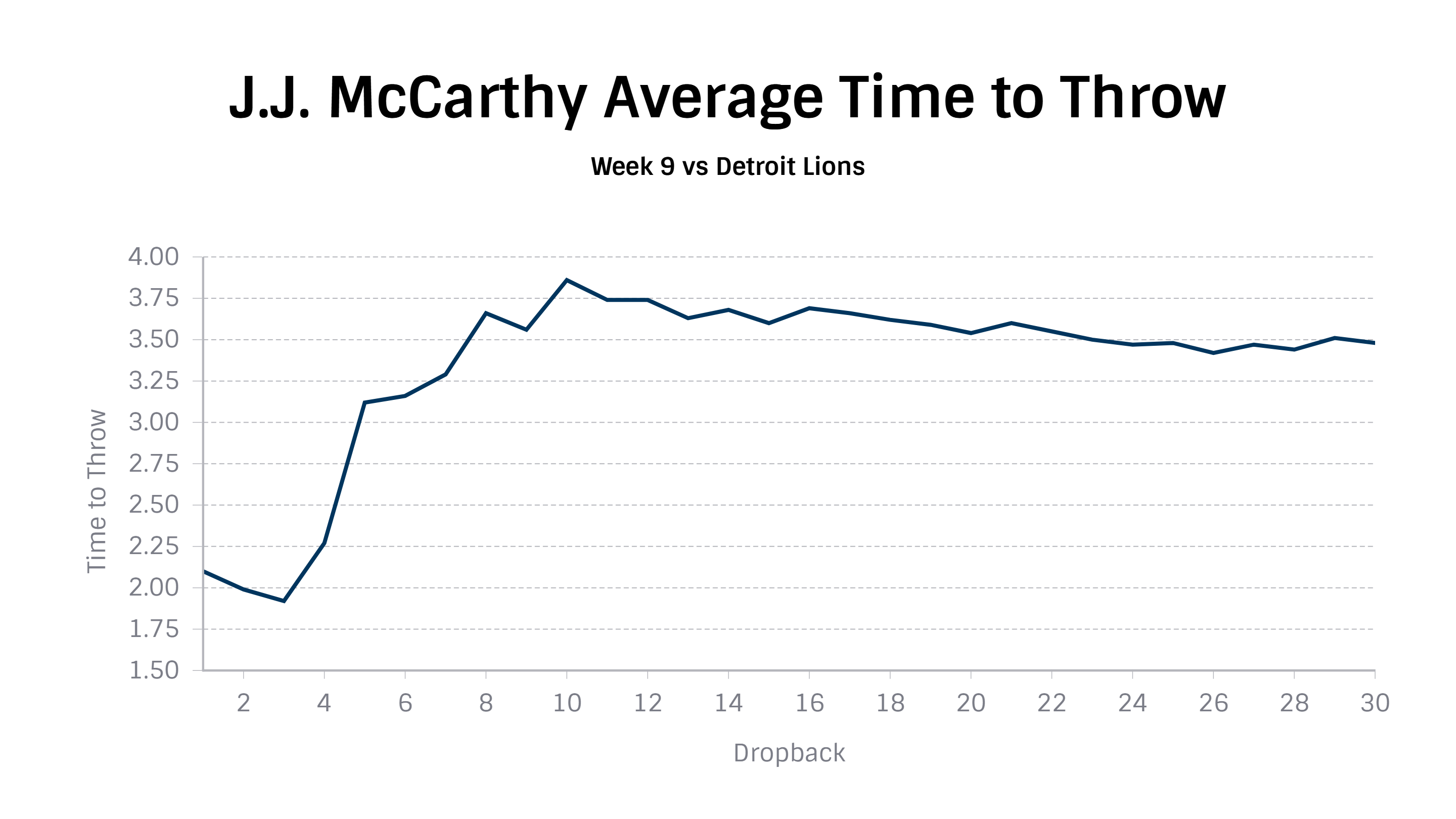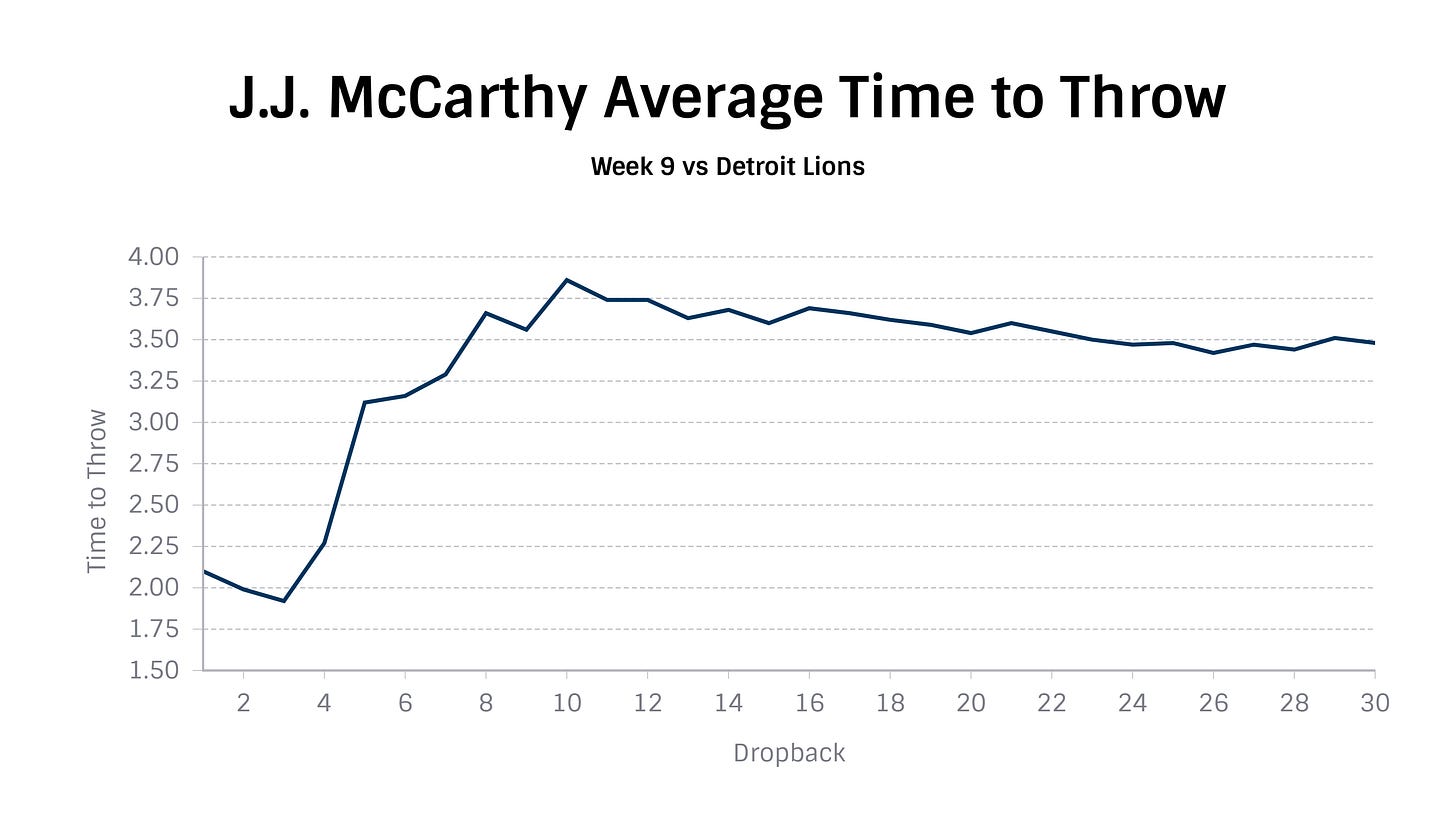 That is important context, but it should also be noted that throughout the second and third quarter, we saw McCarthy hesitate after his first read was gone, with production errors following suit. On throws under 2.50 seconds, McCarthy generated 0.50 EPA per dropback. On throws longer than that, he averaged minus-0.43 EPA per dropback.