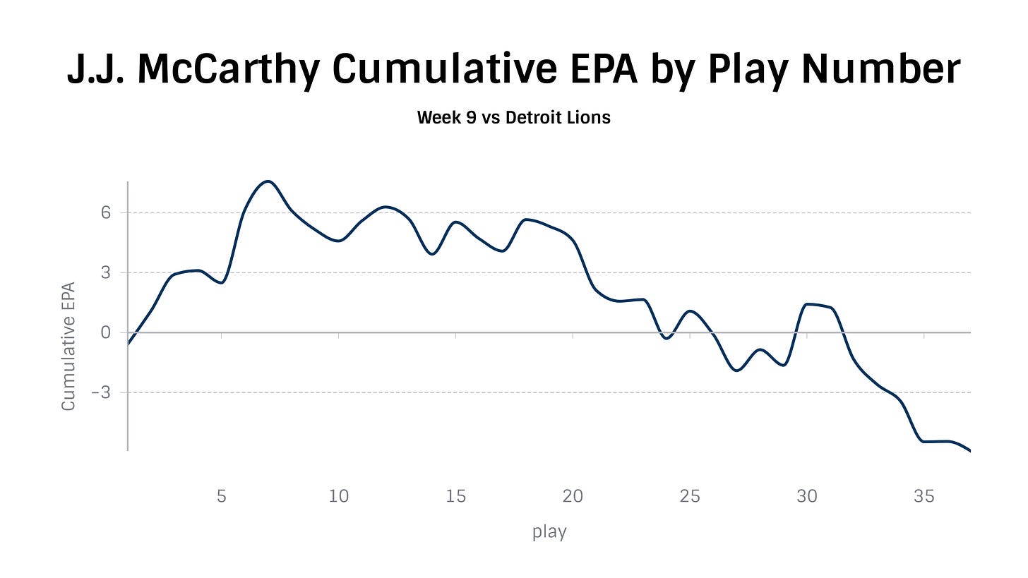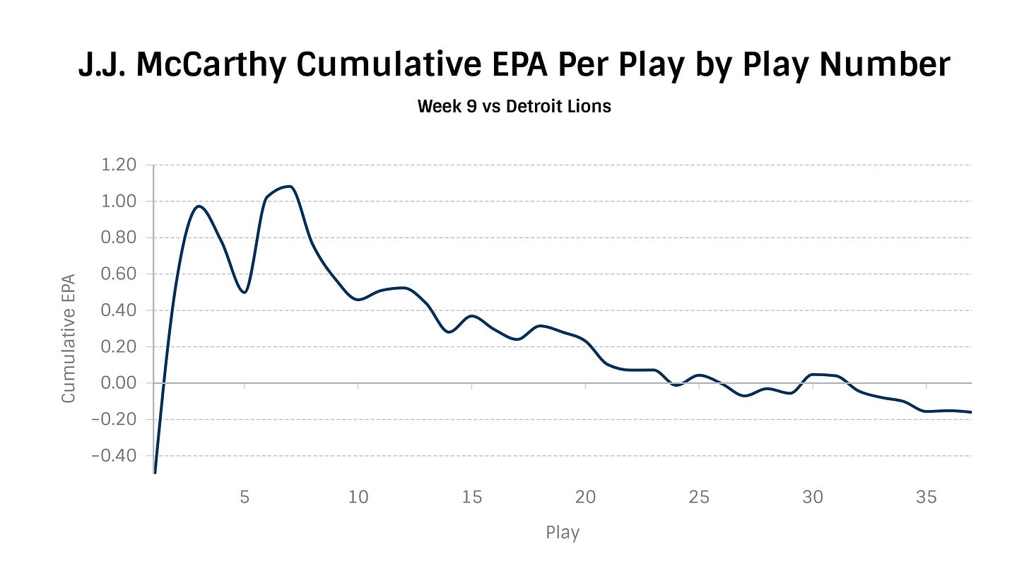 In the first quarter, McCarthy generated 7.57 expected points. In quarters two through four, he generated minus-13.5 expected points.