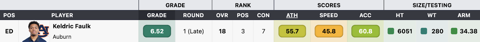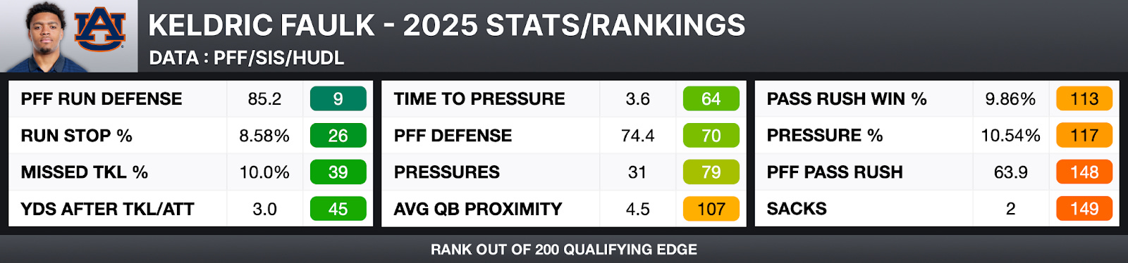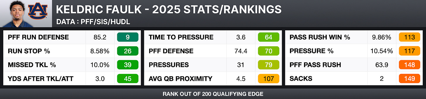 Faulk played multiple positions on Auburn’s defensive front, lining up at 2-4 Tech on 30.3% of snaps this year. This hybrid deployment was not conducive to pass-rushing success and is important context when comparing Faulk statistically to other edge prospects.