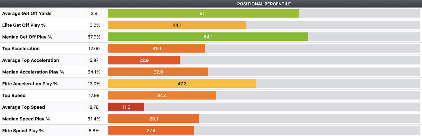 According to in-game tracking, Faulk’s 2.8 average get-off yards ranks in the 61st percentile for edge rushers. His bend, arc-speed and lateral quickness, however, are sub-par.