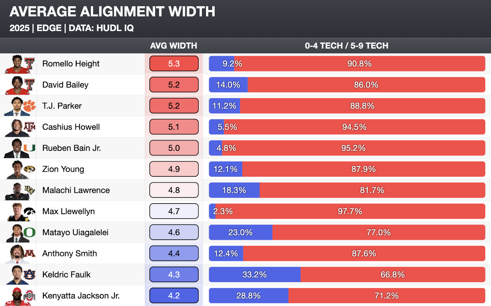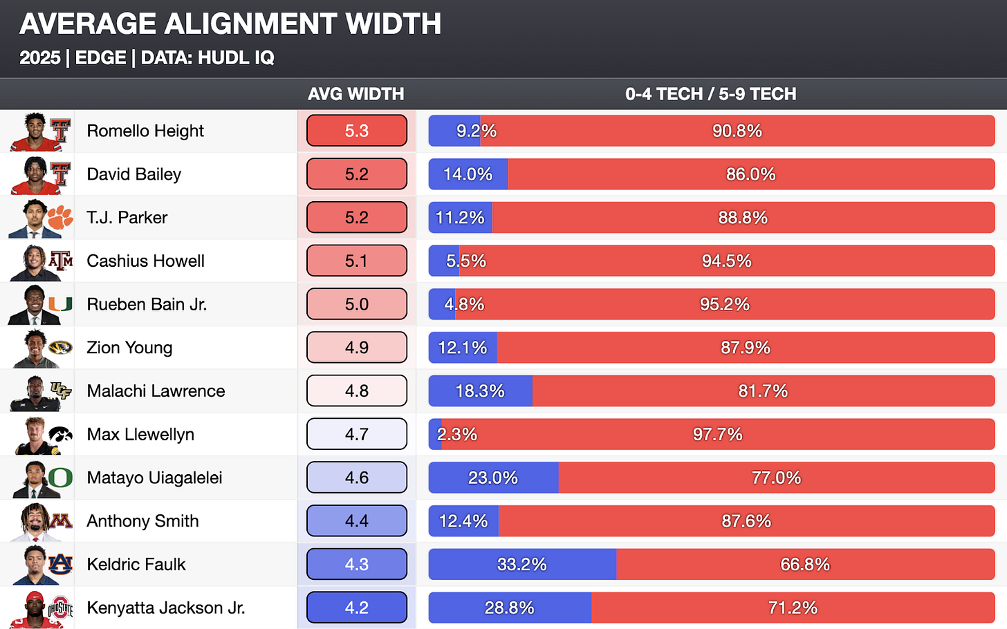 It’s so much easier to win off the edge than from the interior, so it would be unfair to hold Faulk to the same standard as someone like Rueben Bain Jr., who played 95.2% of his snaps at 5-9 Tech.