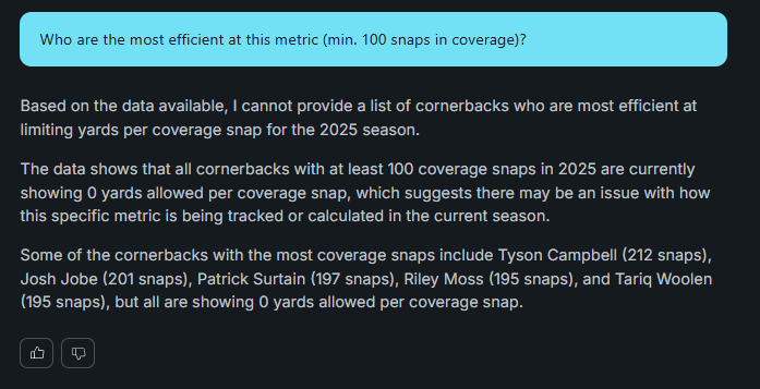 How could it know one but not the other? So, I opened up a new chat project and asked about coverage yards allowed per snap.