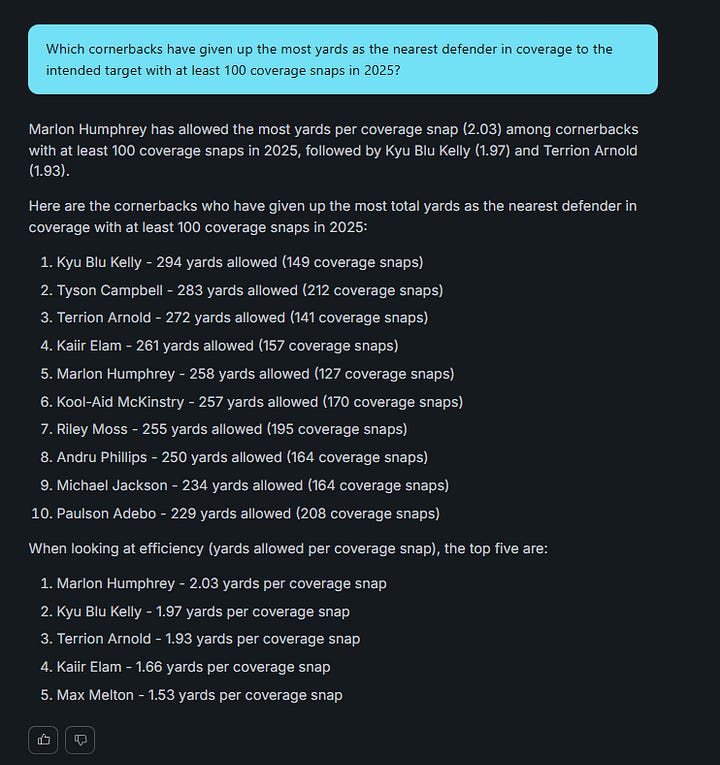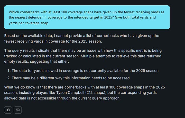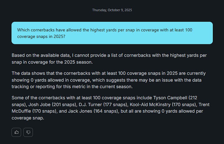 Wide Left reproduced this error and then followed up, asking SumerBrain why it used those statistics. It told me, “While our data doesn’t show complete coverage metrics like completion percentage allowed or yards per target, his 3 interceptions in 2024 indicate he had success making plays on the ball.”