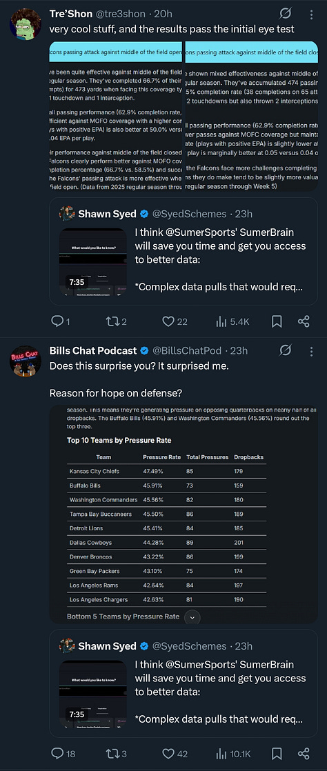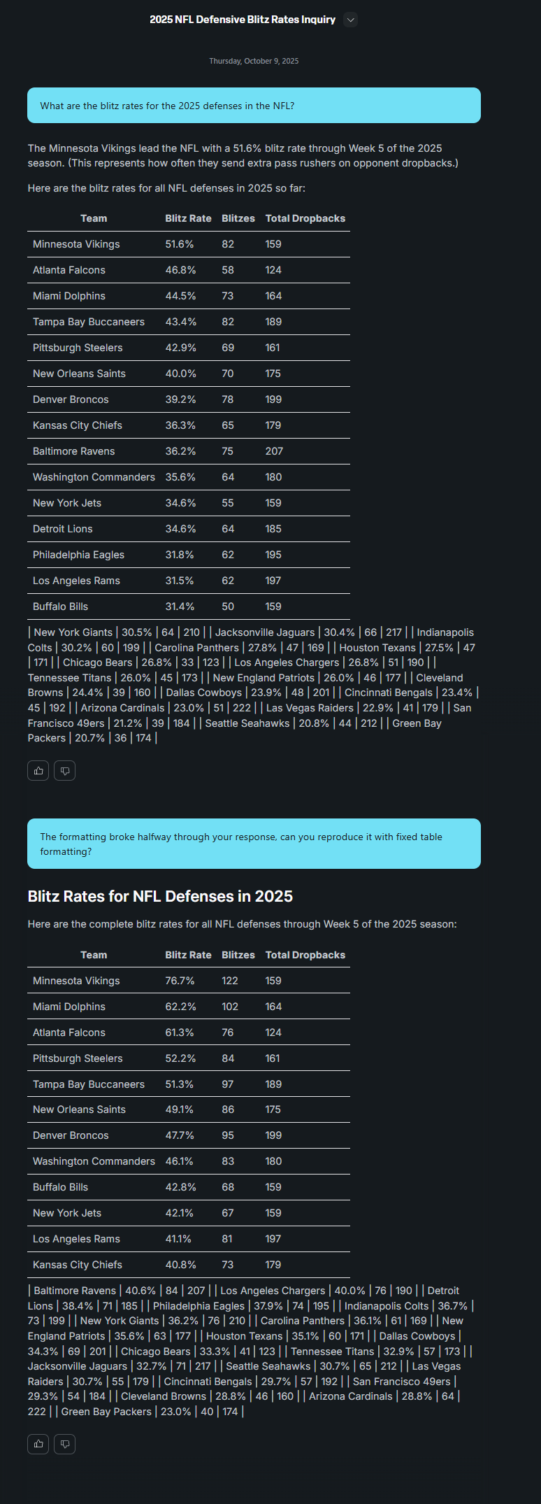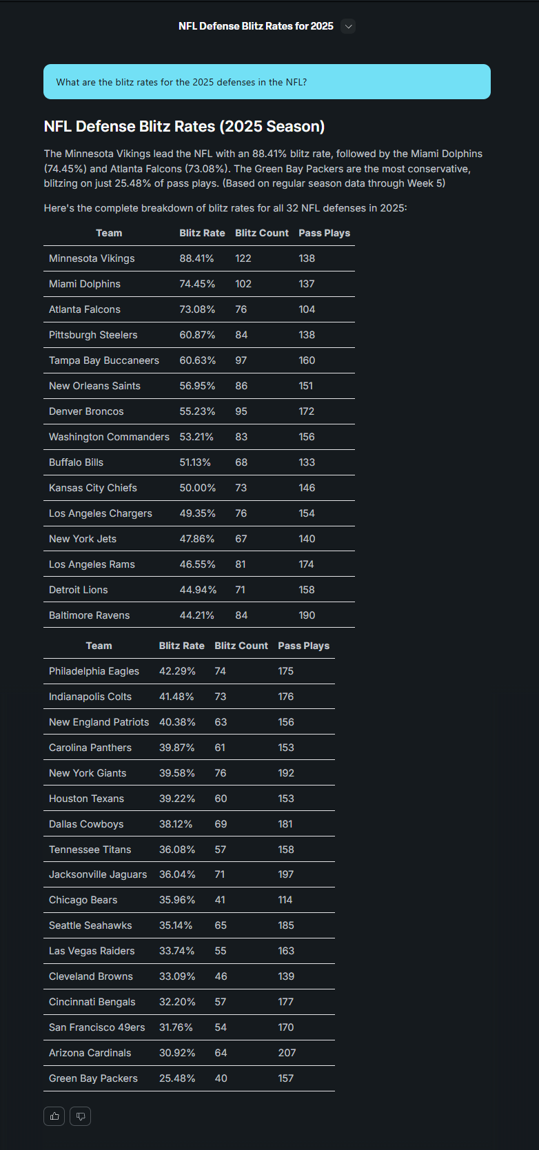 I wanted to double-check SumerBrain’s blitz data against what their database actually charted, and Wide Left was able to acquire a partial list of actual blitz rates from their database. Looking at that list and discussing it further with others, it’s clear that Sumer is confident about its internal charting and what it identifies as a blitz. The issue is not with the data that undergirds the service — but rather how the data is retrieved by the large language model.