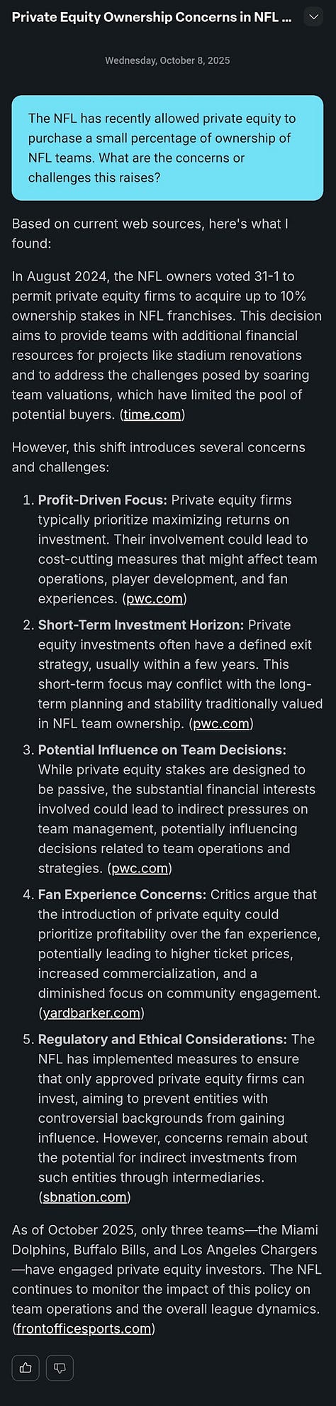 The NFL is considering deploying something similar for sidelines, and Wide Left has been able to confirm that multiple NFL teams are building LLM tools to query their own internal databases. Josh Kendall at the Athletic wrote a story about how this might be implemented.