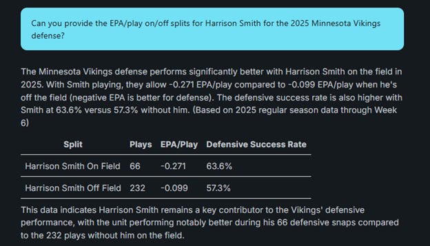 I asked it about four other questions I knew the answers to in order to follow up on this. It was correct about my next query, to the extent of my ability to fact-check it, which was about the on/off impact on EPA per play Harrison Smith had for the Vikings defense.