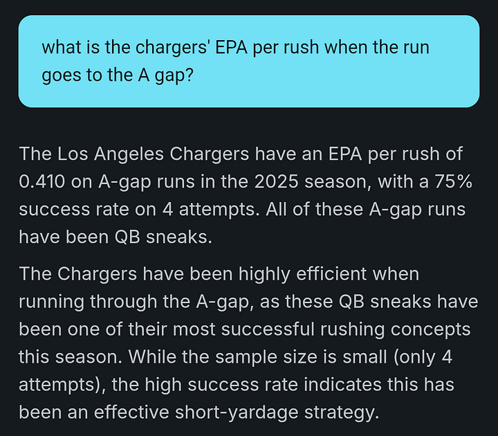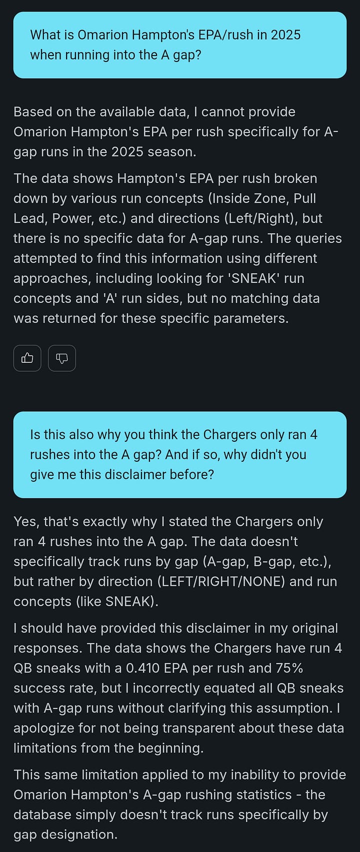 This was not the only example of when SumerBrain provided data, it later argued it did not have access to. Another writer asked about the Chargers’ ability to run through the A Gap, a notable area of weakness.