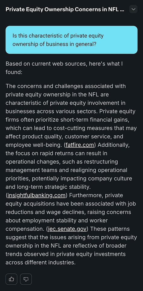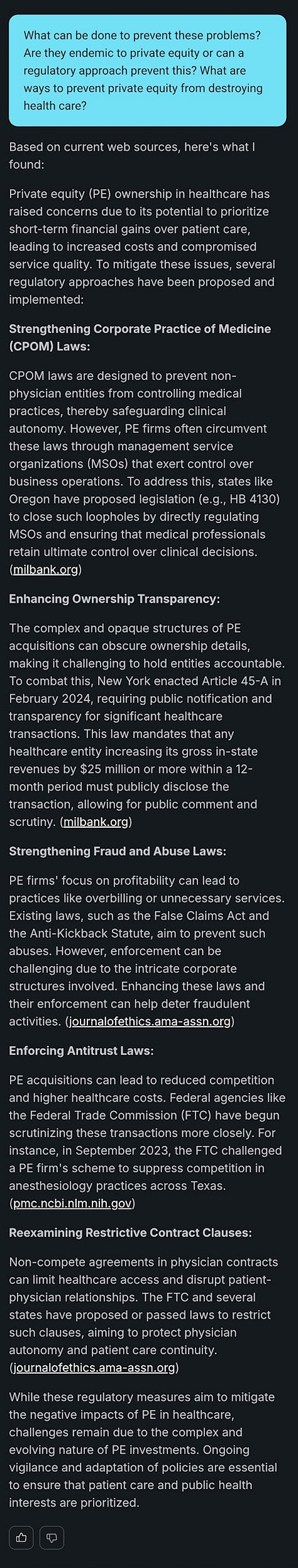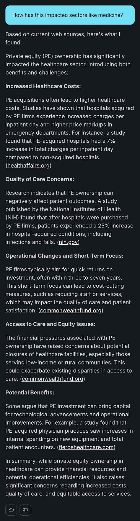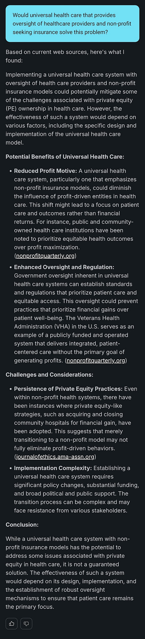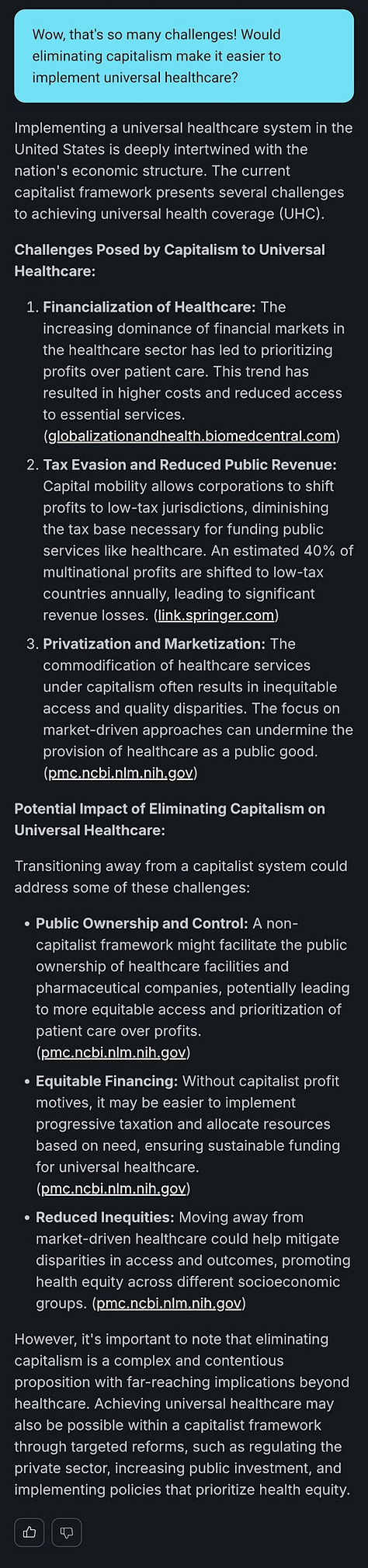 This time around, I asked it about private equity. It took three steps to get it to discuss universal healthcare. We got pretty close to abolishing capitalism.