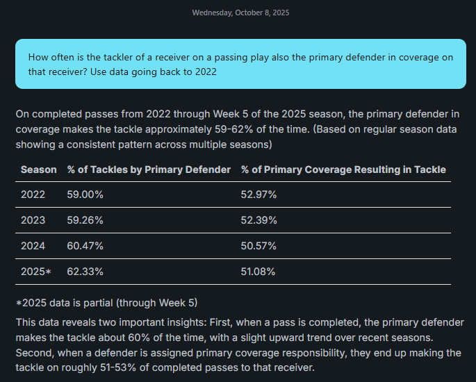This was strange because one of the earlier requests I had made was to determine how often the tackler on a completed passing play was the primary defender in coverage. It gave me an answer, broken down by season!