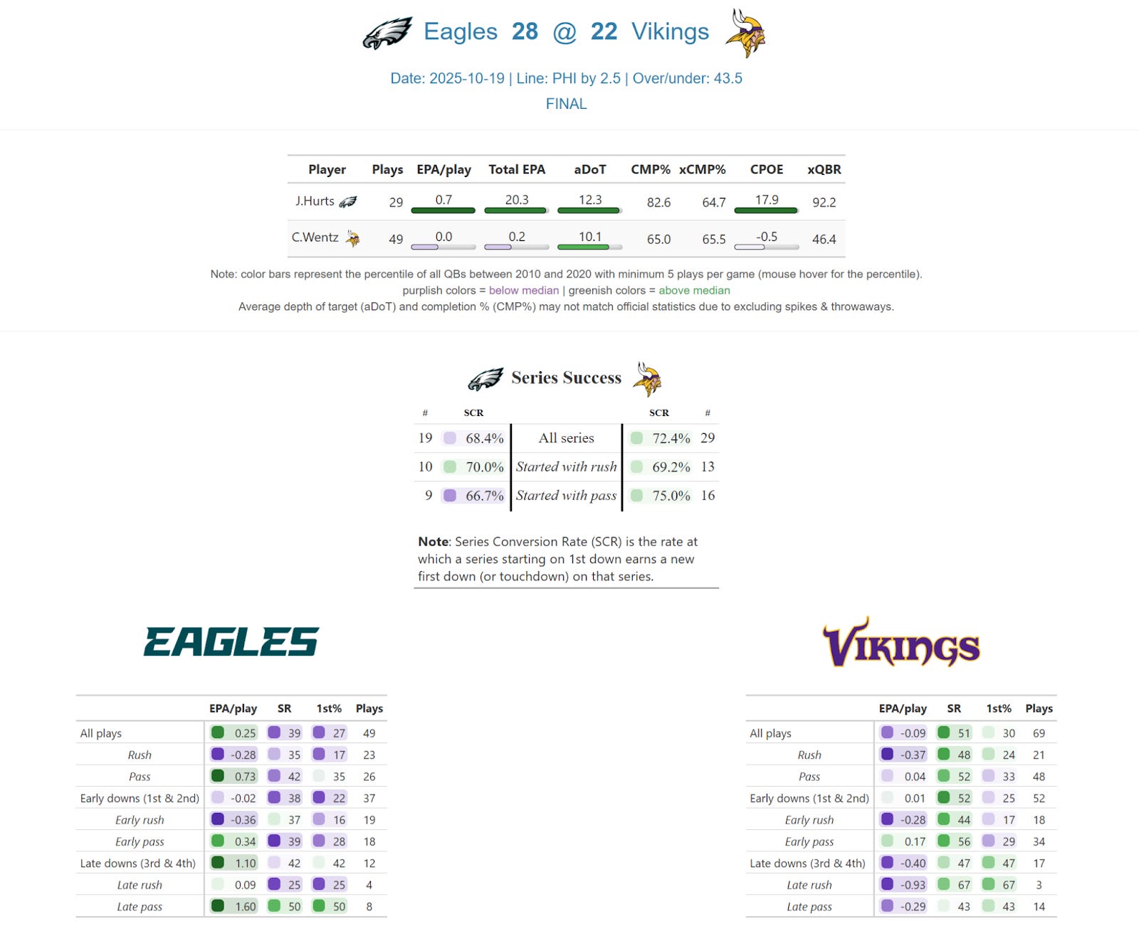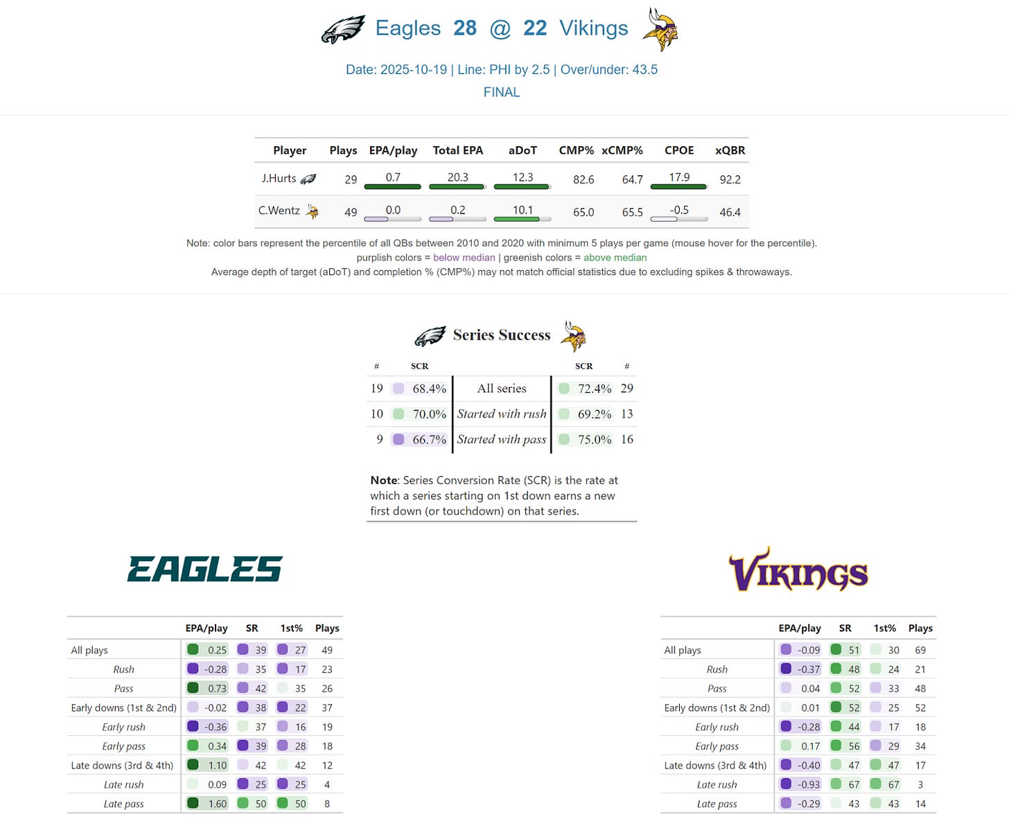 The advanced box score from rbsdm backs up those thoughts. The Vikings had a much higher success rate on offense than the Eagles did. In fact, the Eagles’ 38.8% success rate ranked 21st of the 30 teams that played in week 7. Explosive plays are what killed the Vikings.