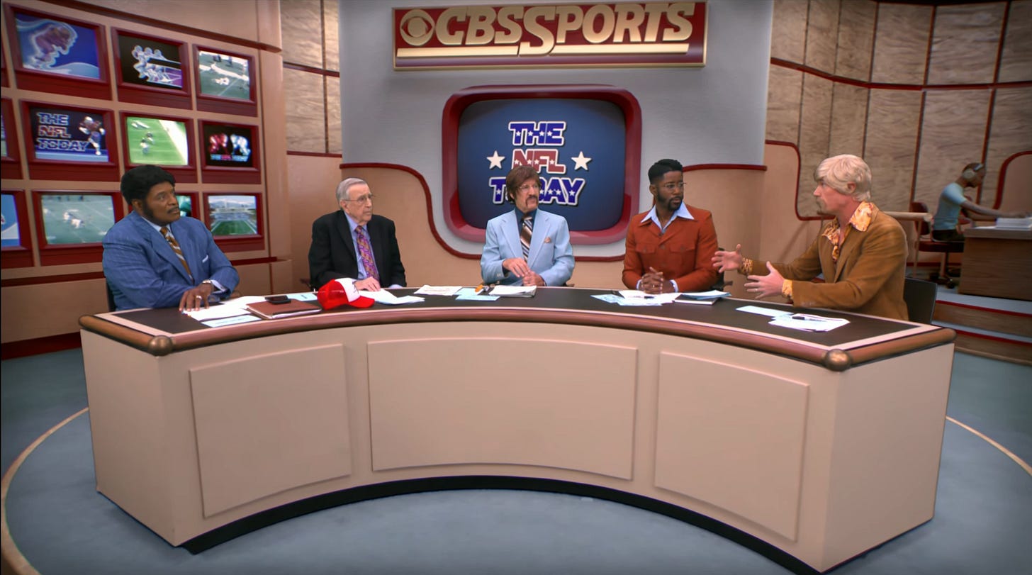 CBS Sports, which televised the Bengals-Vikings game, began the pregame festivities with a throwback broadcast, complete with digitally reconstructed sets from their 1970s broadcasts and costumes for all their personalities.
