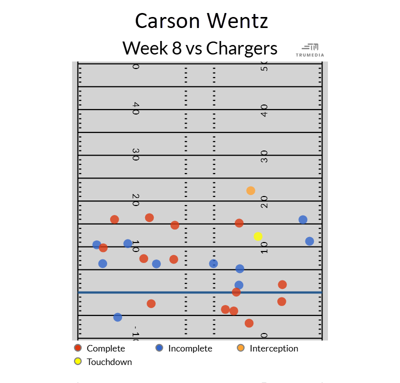 Had this been a deep-ball offense, a sub-60 percent completion rate could produce an efficient, if volatile quarterback. But Wentz only threw the ball 4.6 yards downfield — a 4th percentile mark (in other words, 96 percent of individual quarterback games featured passers who threw deeper downfield than Wentz did in this game).