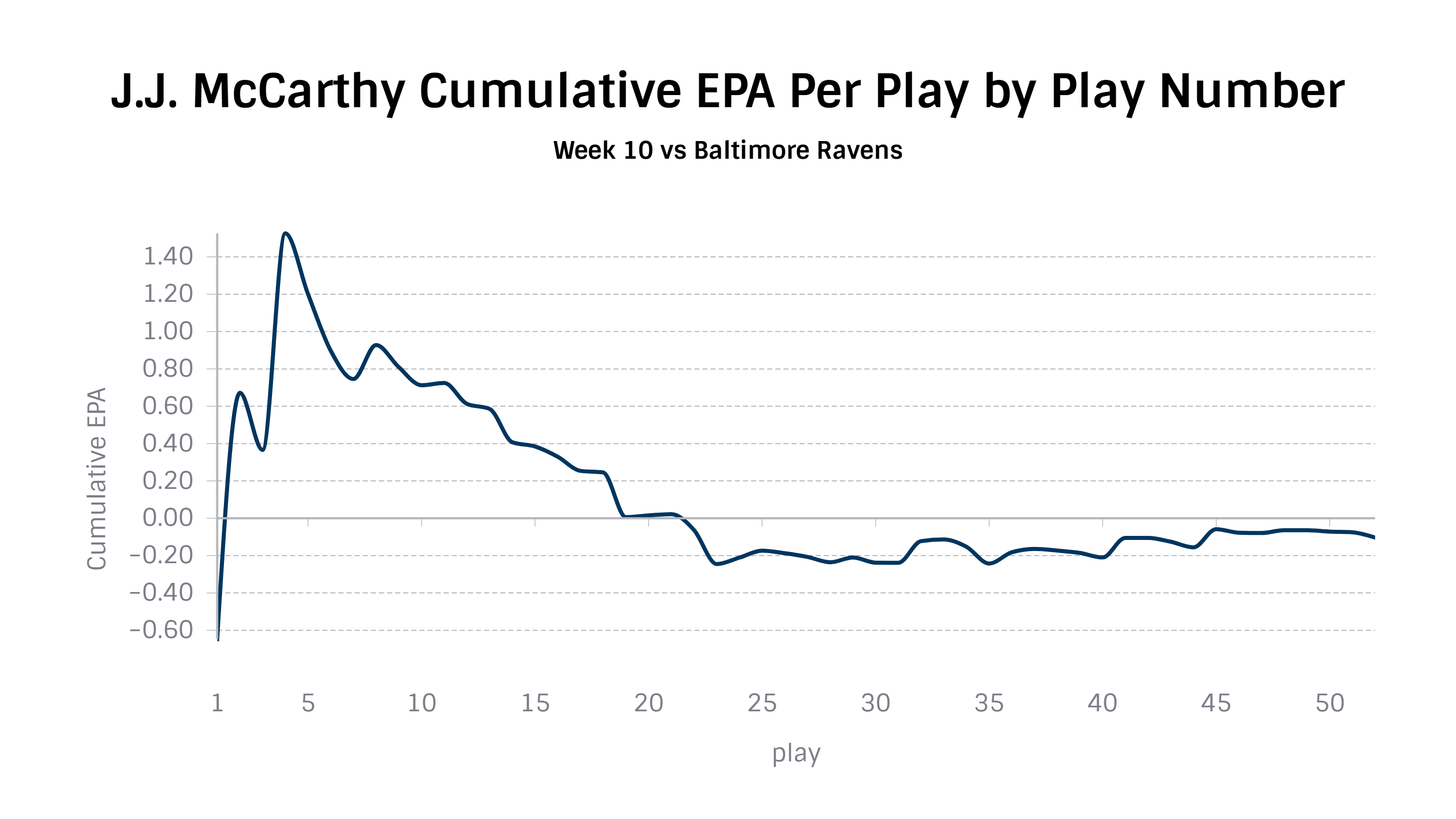 The Vikings maybe should have benefited from a pass interference penalty for Jefferson in the end zone but also benefited from legitimate, but softer, pass interference penalties on the subsequent drive. All in all, these EPA charts give us the broad strokes of McCarthy’s play: sharp to start, then regression.
