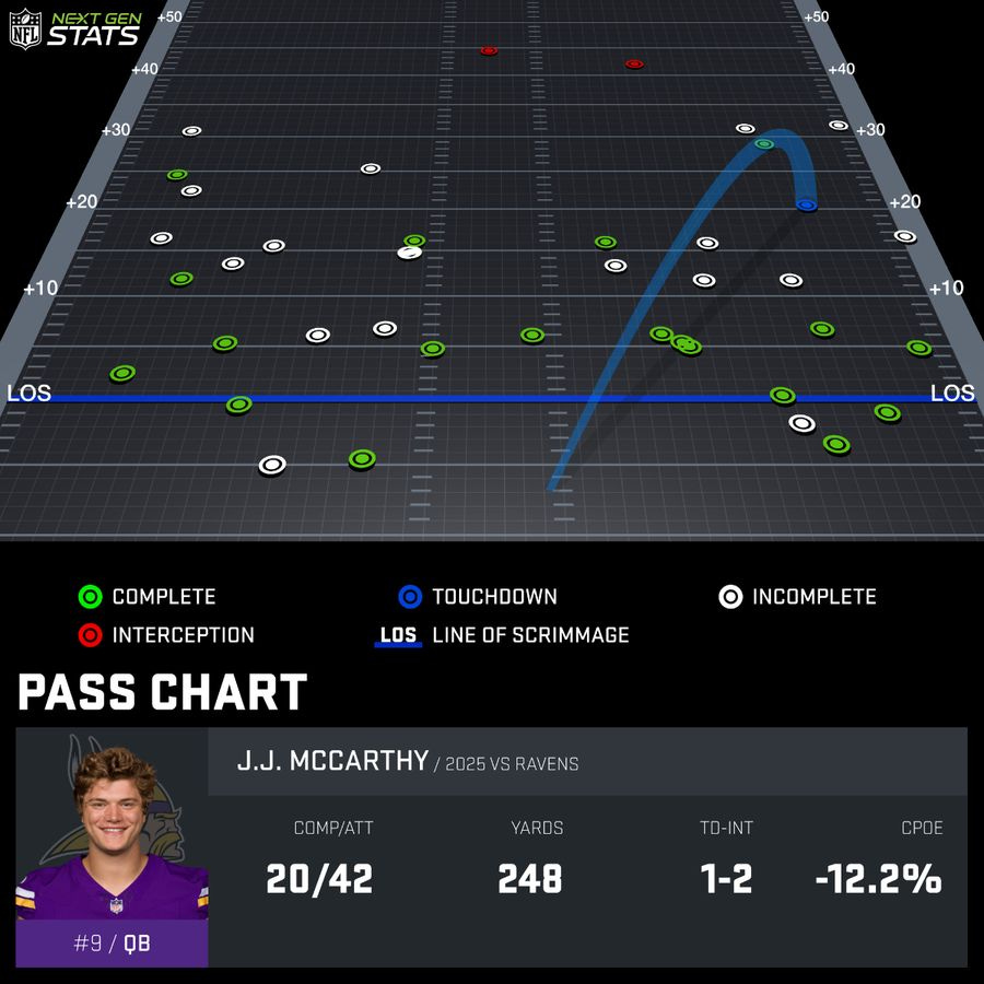 We can, of course, parse fault — McCarthy was perhaps not at fault on his second interception, where Justin Jefferson fell down, but also threw an interceptable pass on a throw to Jordan Addison that was ultimately ruled incomplete.