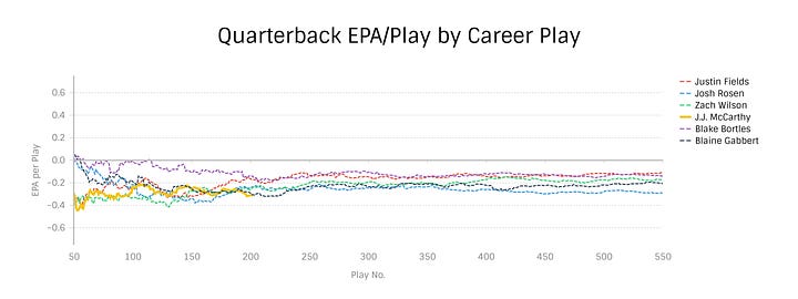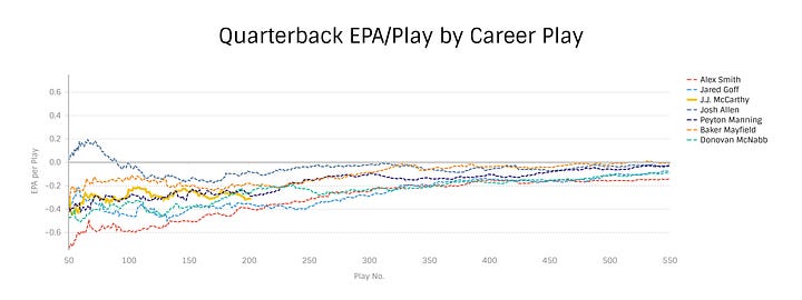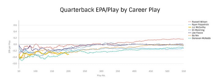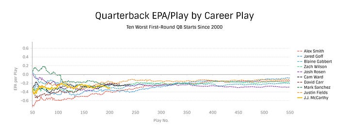 This is the 15th-worst career performance since 2000 of any quarterback in the NFL. It is entirely possible that he gets out of this category, of course, because many of these quarterbacks have played for multiple games across multiple seasons while McCarthy is just beginning his career. But it’s not a wonderful start.