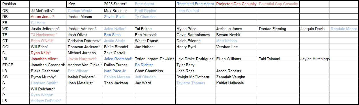 To help us determine team needs, I’ve listed all Vikings players for 2025 and color-coded those who are free agents and those who might be cut. Let’s dive in.
