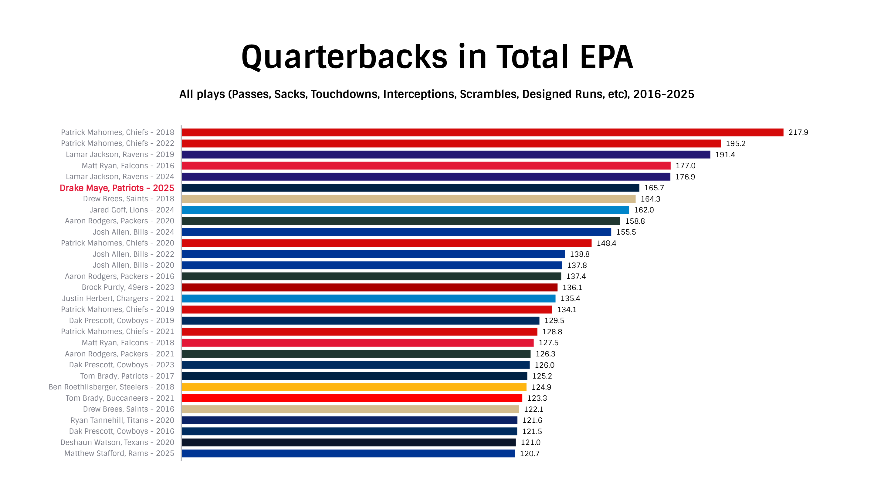 Maye ranks sixth in total EPA generated on quarterback plays in the last decade, and on just passing attempts alone, ranks second. His ability to pin passes to receivers despite throwing deep downfield — even with an average receiver corps and offensive line — is among the best we’ve ever seen.