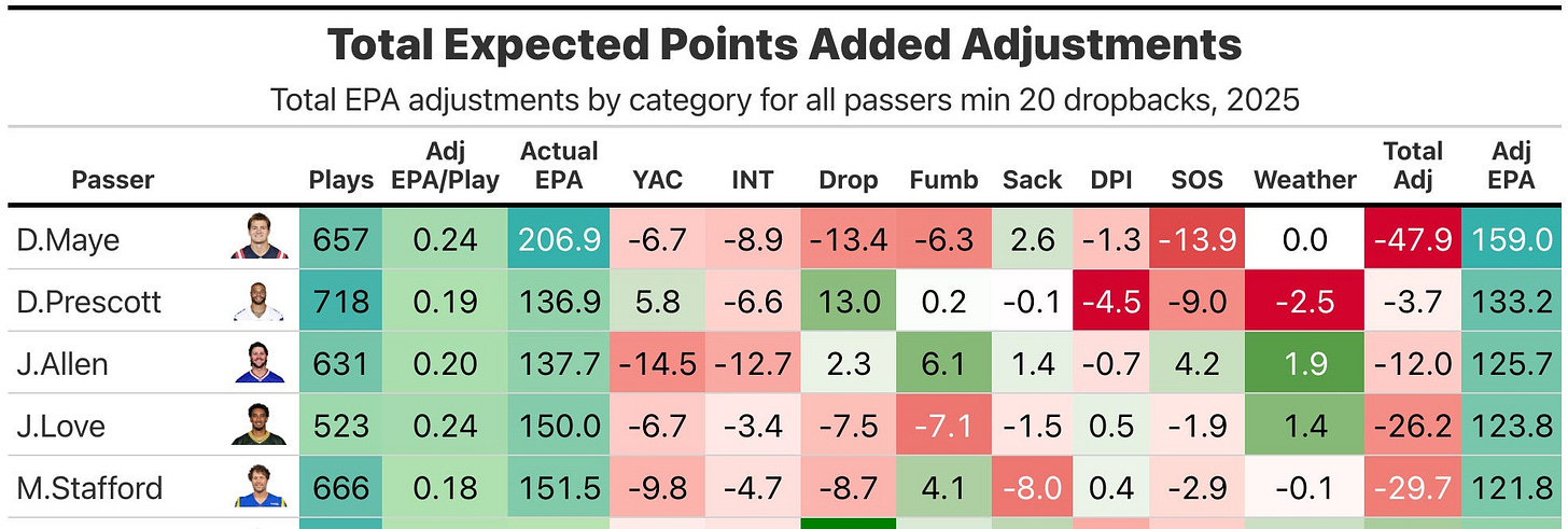 While the argument about his genuinely soft schedule is valid, a holistic correction for elements like opposition, weather, supporting cast, interception luck and so on still places Maye ahead of an impressive quarterback like Matthew Stafford.