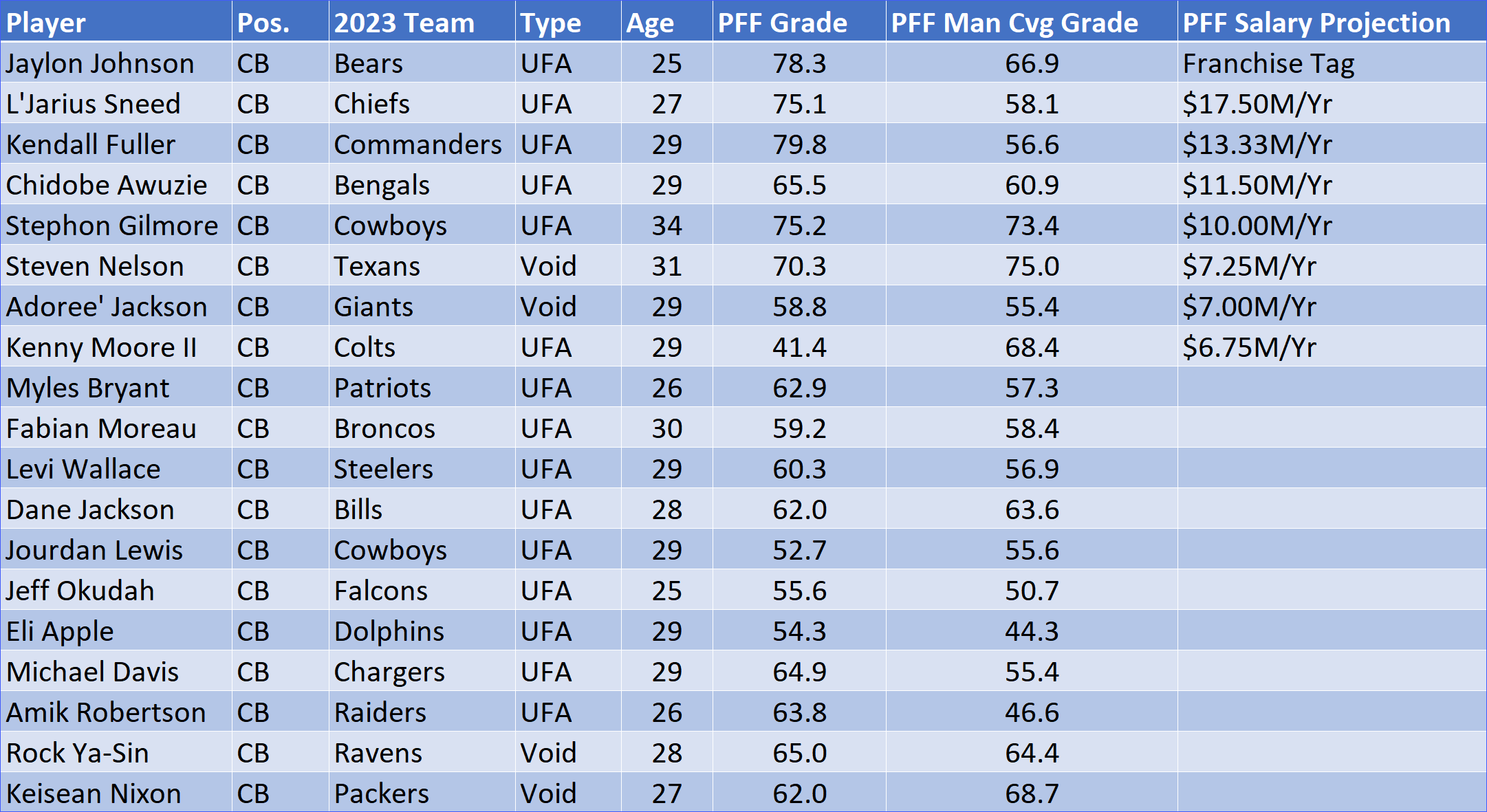 Obviously, if Jaylon Johnson becomes available — something PFF does not project — the Vikings should target him. I feel the same about L’Jarius Sneed despite that price tag. There are potentially value opportunities with players like Rock Ya-Sin and Keisean Nixon, though Nixon is a bit more of a slot corner.