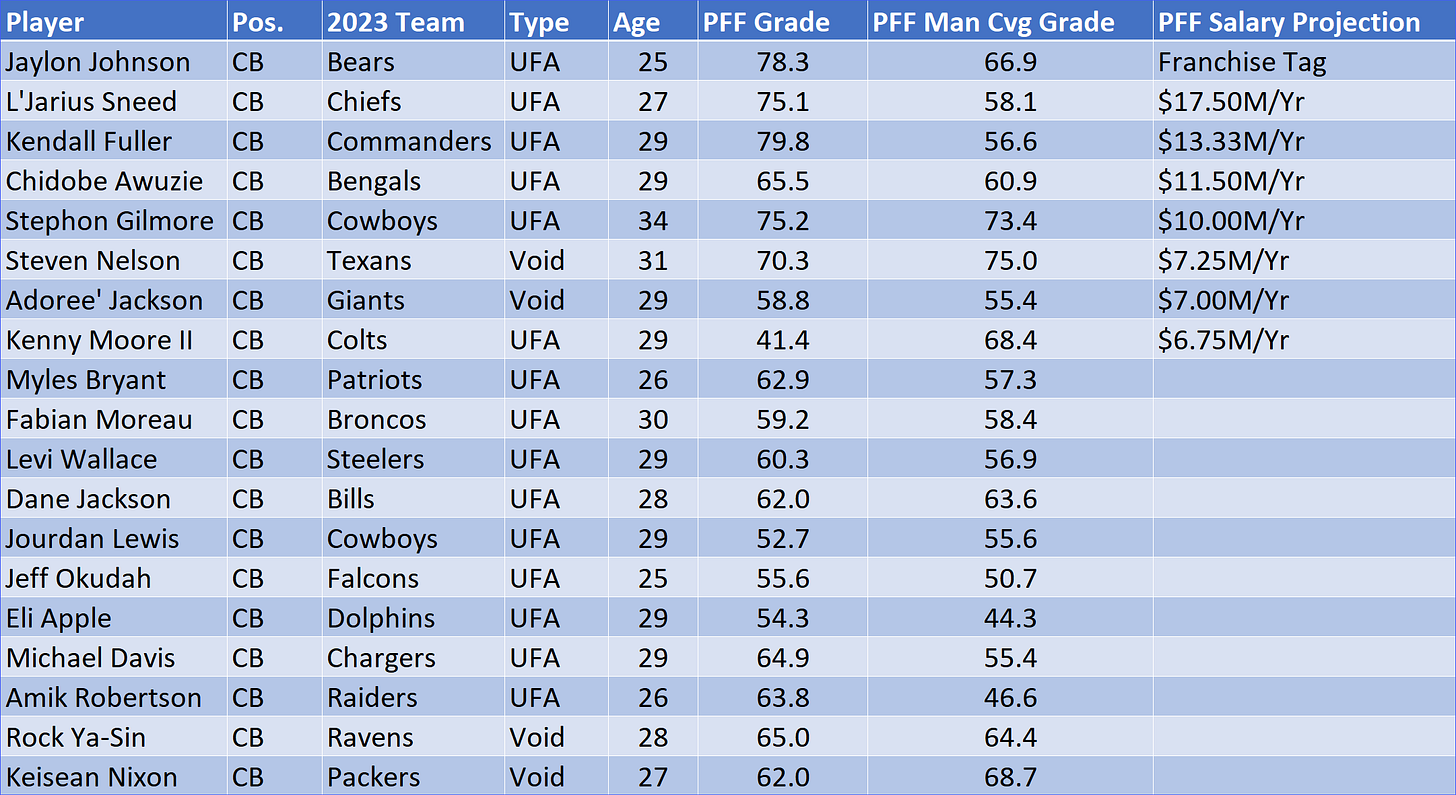 In addition to that, I discuss the type of cornerbacks the Vikings need to pursue and list off a few names. Here’s a chart of free agent cornerbacks using PFF grades over the past two years in man coverage.